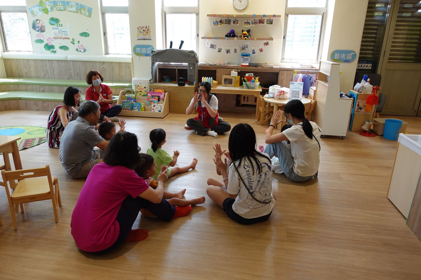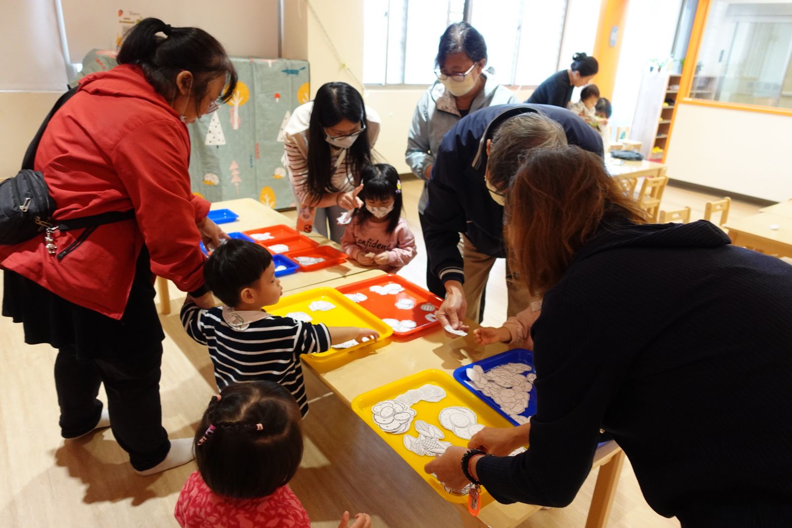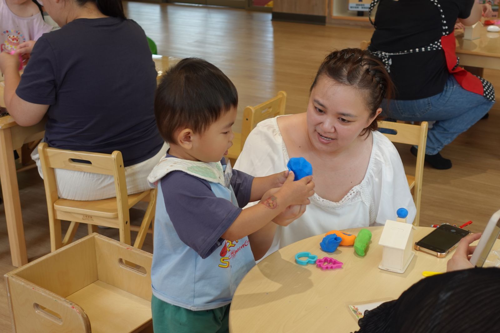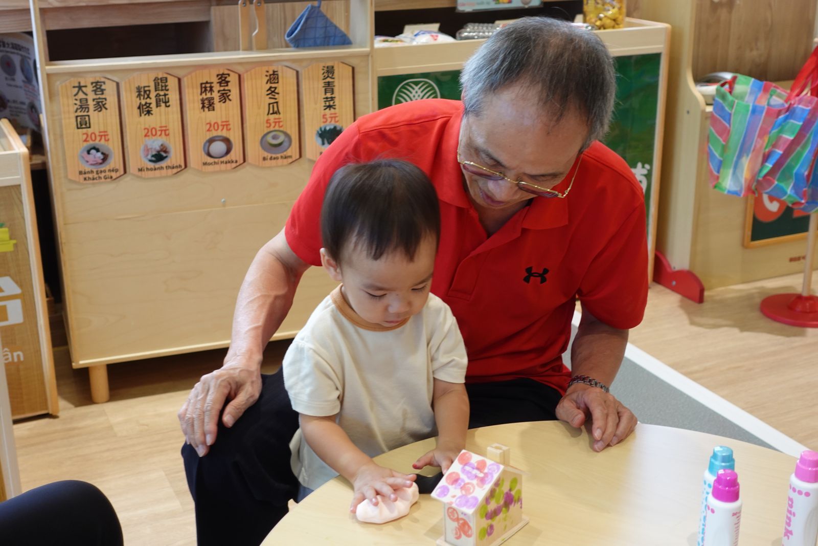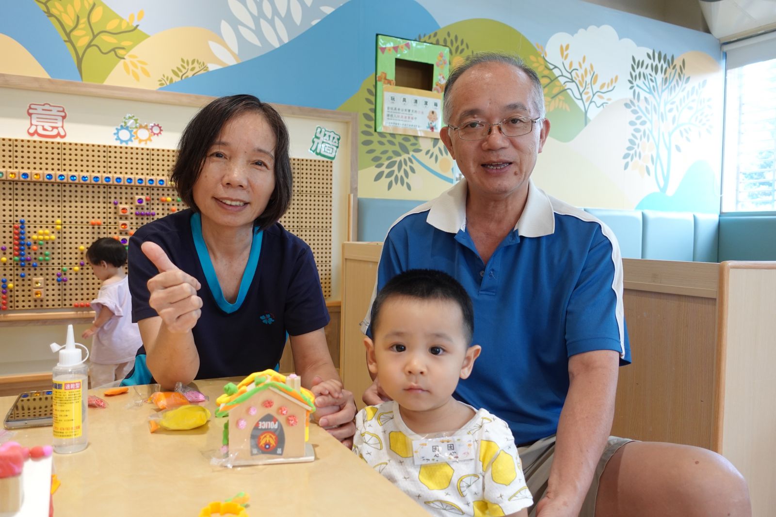 老師帶著親子一起玩「社區logo大挑戰」!大家動動腦,猜猜圖書館、警察局、台電等logo長甚麼樣子呢?有些親子非常厲害的一下子就猜出來了。接著動手時間到,大小朋友們用黏土與泡泡土搓一搓、壓一壓,做出房子上的可愛裝飾,再貼上自己選的logo,讓房子變身成獨一無二的小店。完成後還能帶回家當存錢筒,既有趣又實用,讓孩子在創作中認識社區、做出專屬自己社區的小店!