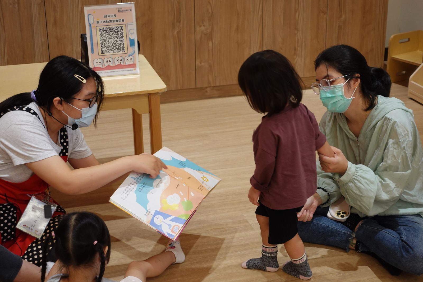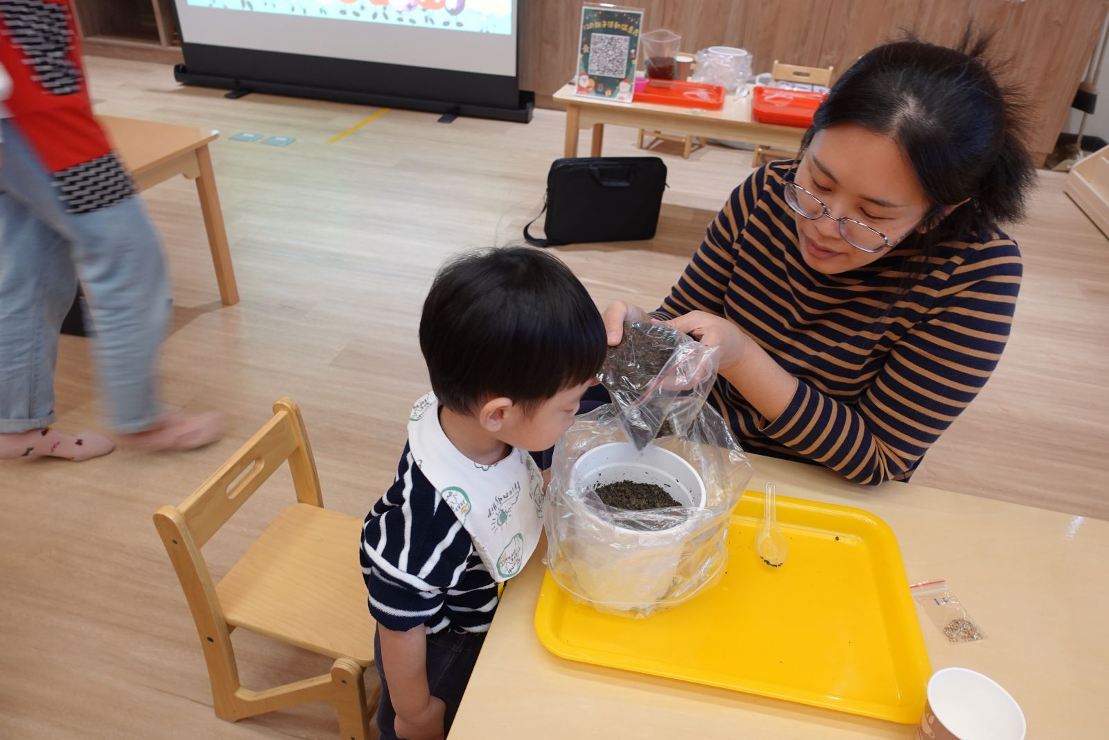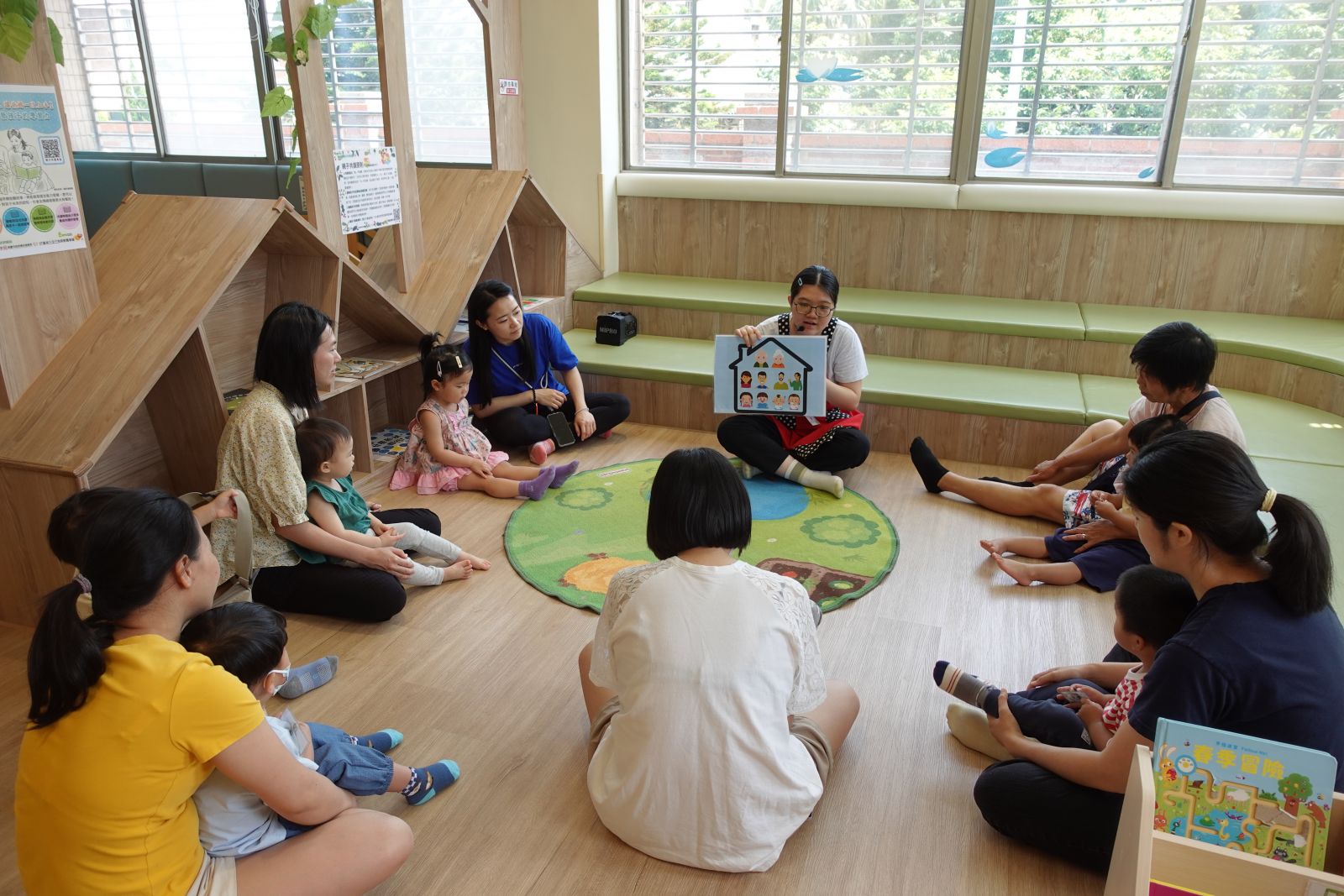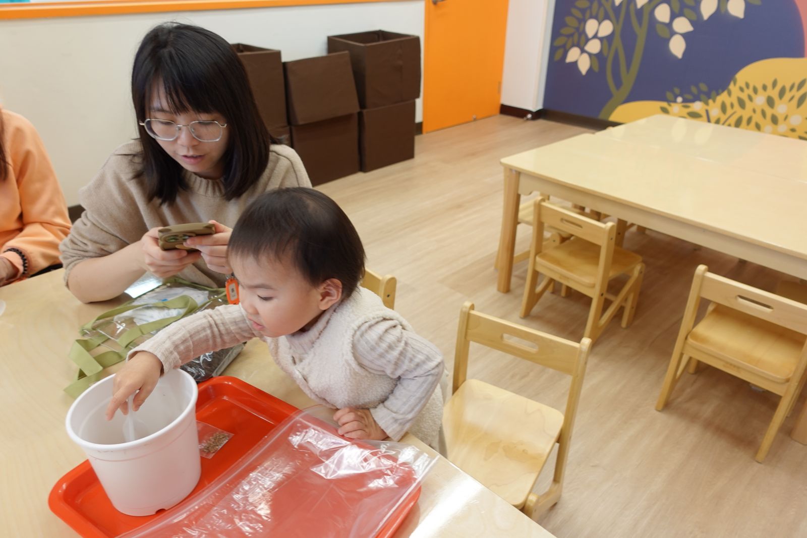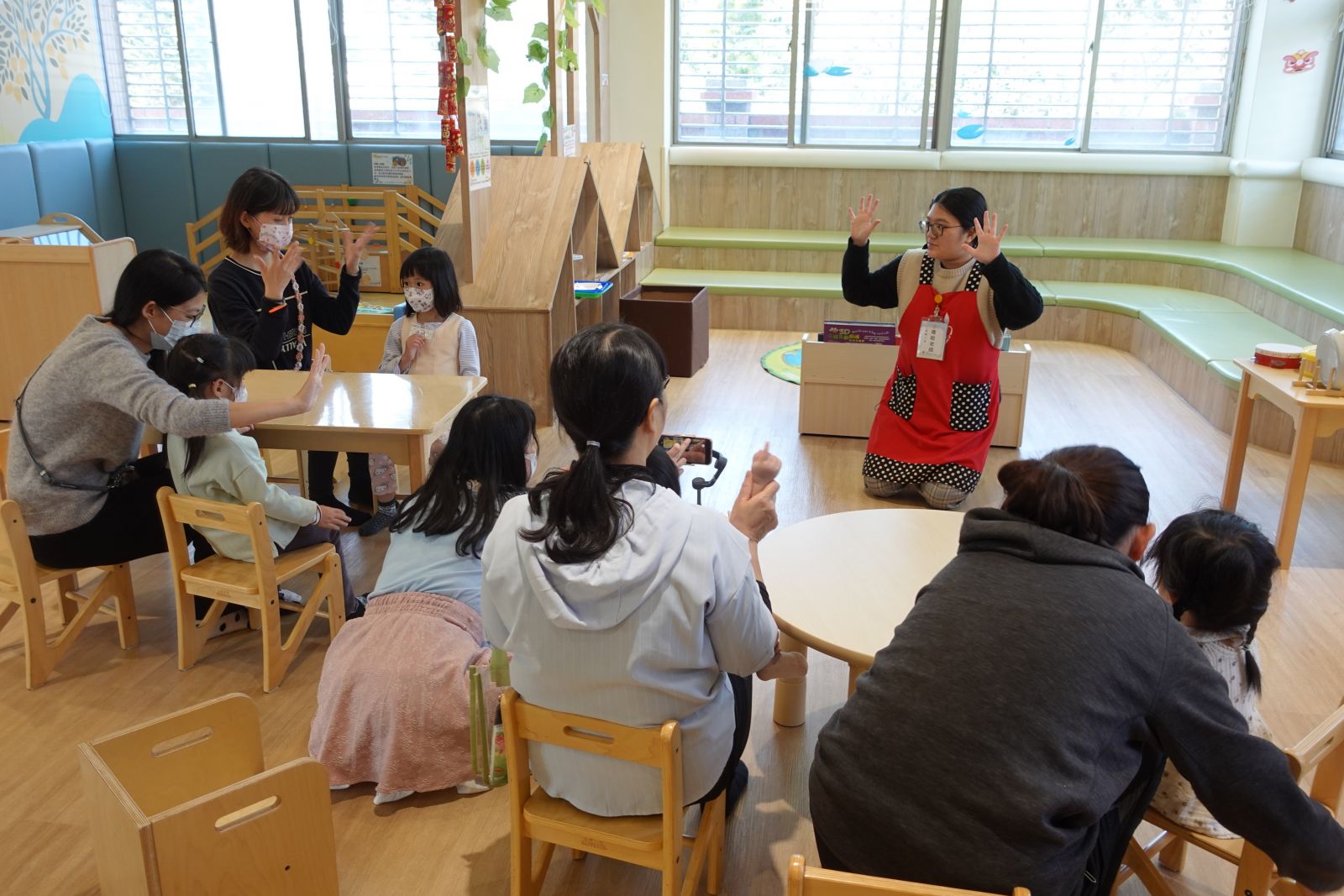 老師帶著親子一起玩「社區logo大挑戰」!大家動動腦,猜猜圖書館、警察局、台電等logo長甚麼樣子呢?有些親子非常厲害的一下子就猜出來了。接著動手時間到,大小朋友們用黏土與泡泡土搓一搓、壓一壓,做出房子上的可愛裝飾,再貼上自己選的logo,讓房子變身成獨一無二的小店。完成後還能帶回家當存錢筒,既有趣又實用,讓孩子在創作中認識社區、做出專屬自己社區的小店!