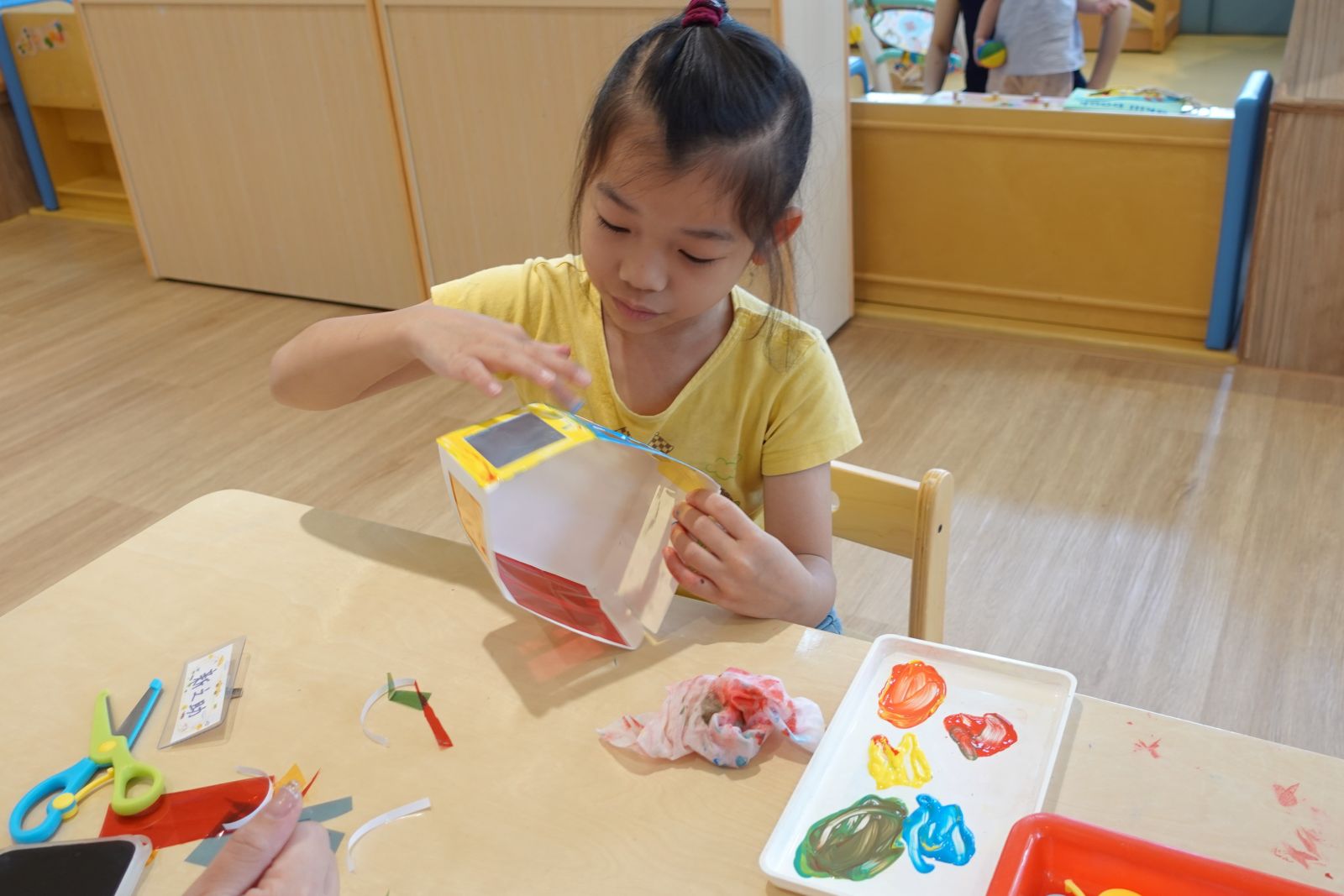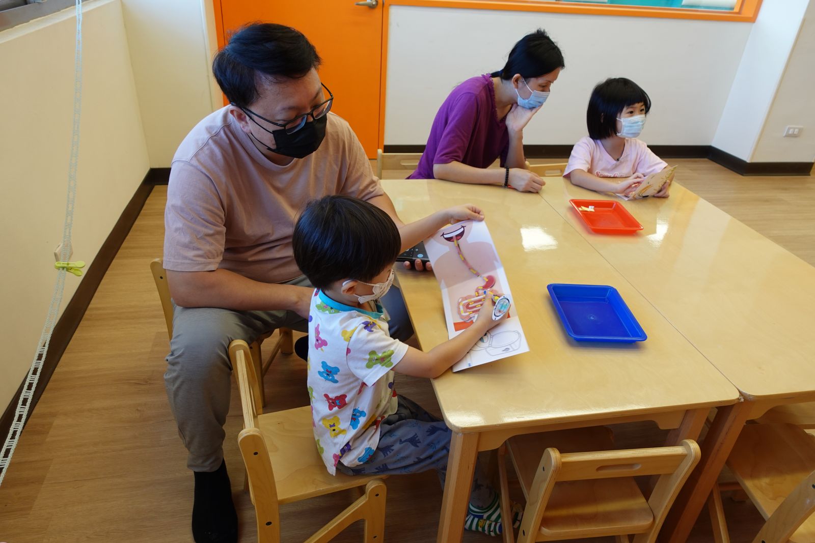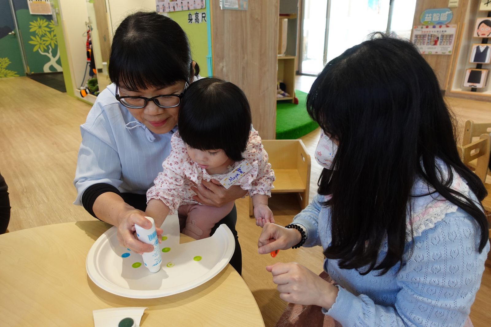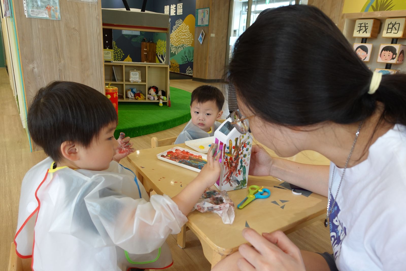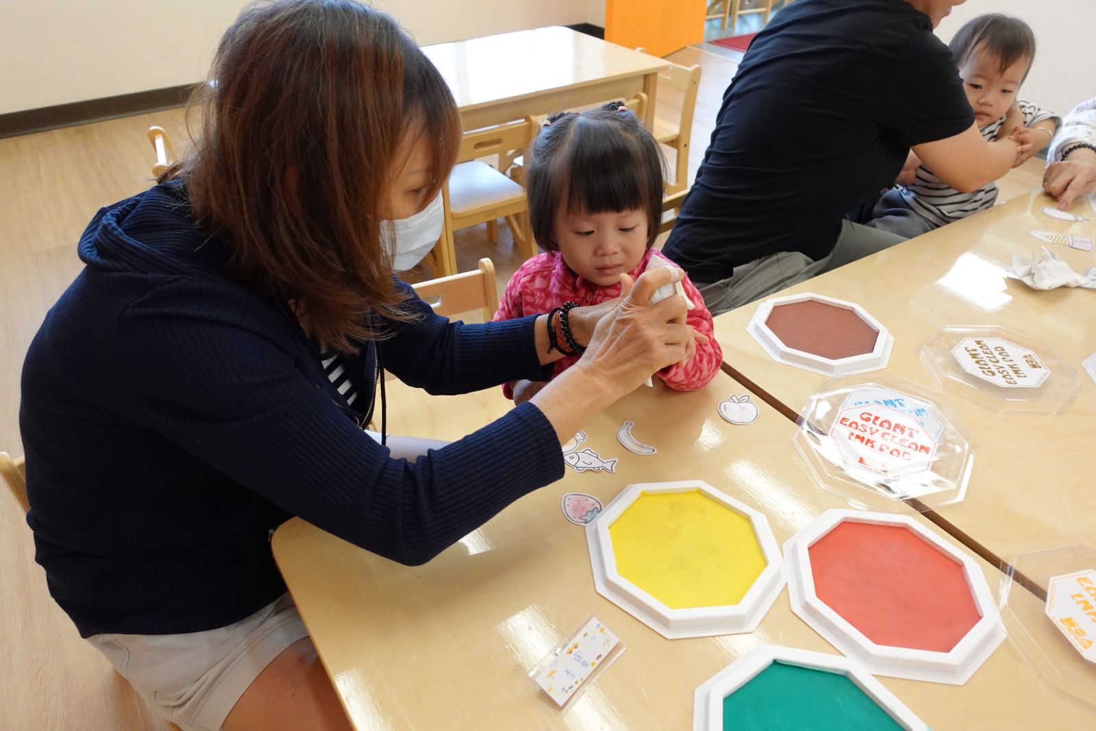 本次活動配合主題:大房子小房子,老師帶大家一起認識台灣常見的房子,親子分享自己的家長甚麼模樣,接著一起製作五彩繽紛的房子,用手指當做畫筆,感受顏料的觸感、色彩的混合,任意地塗抹在作品上,創作出屬於自己獨一無二的房子。作品帶回家後還可以放進自己的小玩具,讓玩具有個家喔!