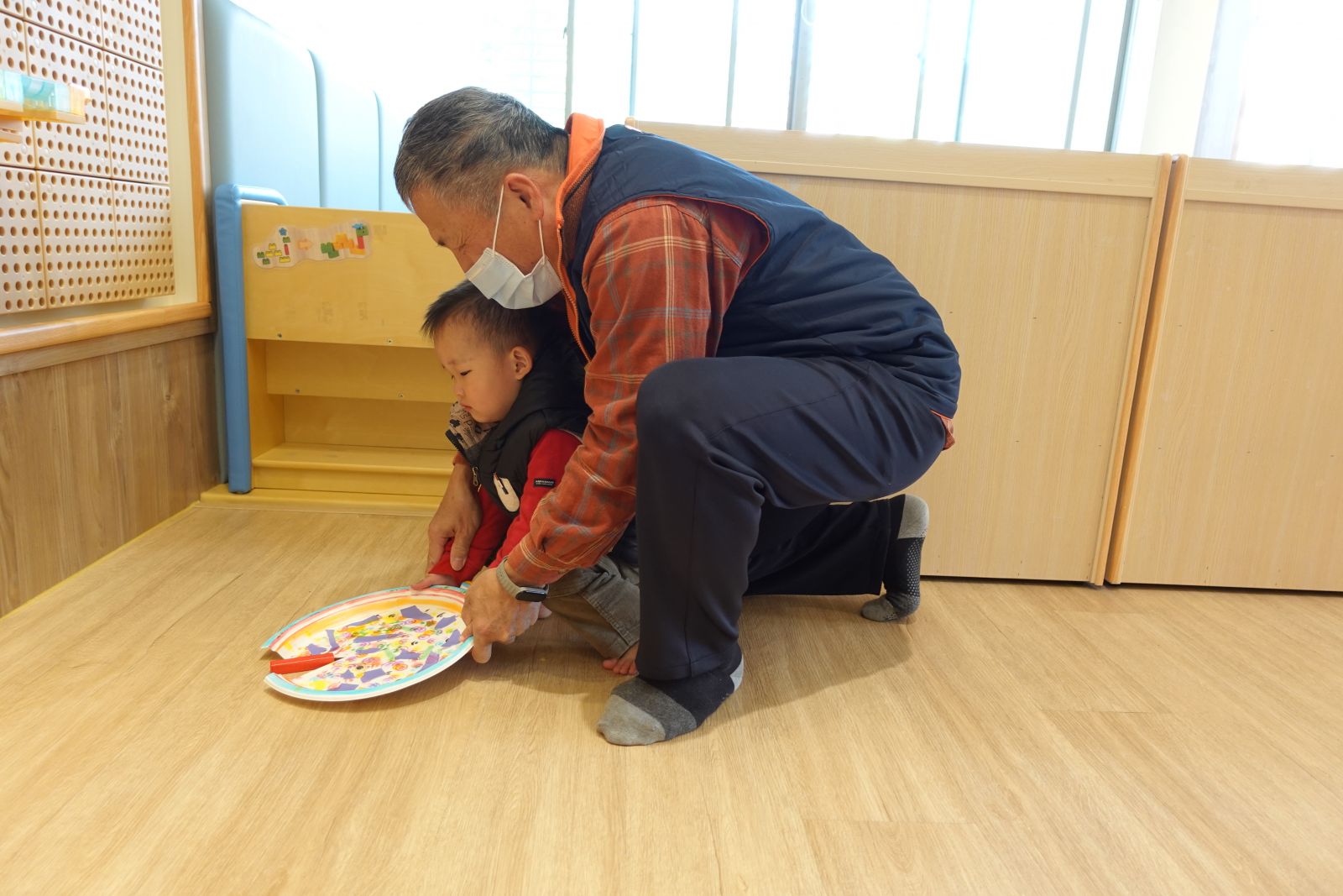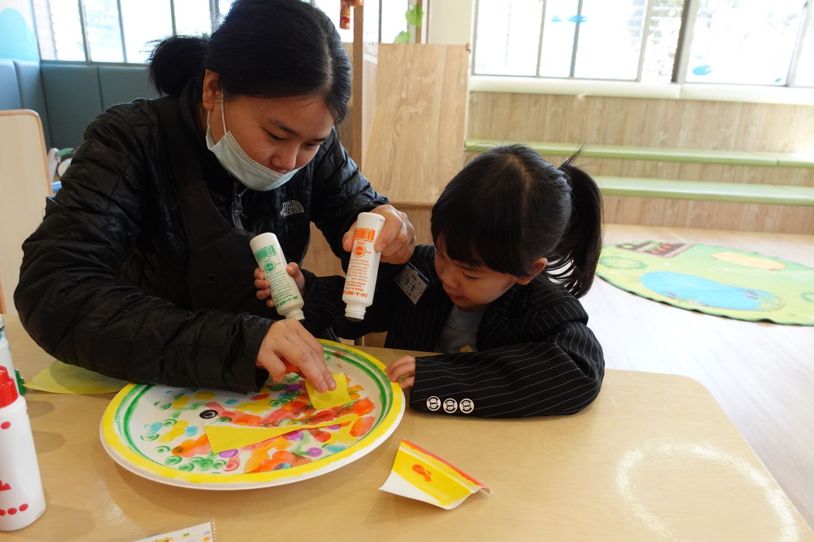 本月老師帶大家用紙盤製作-魚造型 掃地機器人,利用點點筆及色紙在紙盤上創作,畫出獨一無二的魚鱗,接著把尾巴和眼睛黏上去,就完成囉!最後老師帶著大小朋友們一起餵小魚吃飼料,用作品將地上的玩具吃進小魚的肚子裡,再倒進玩具箱內,讓孩子用有趣的方式練習收玩具喔~!