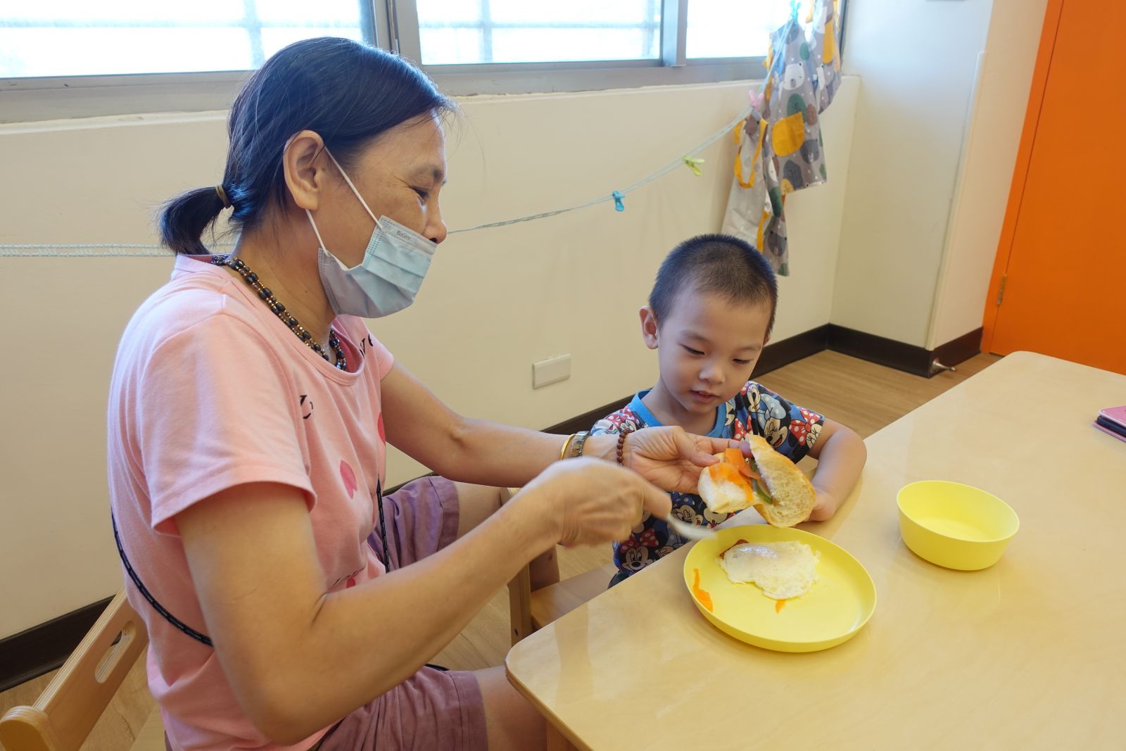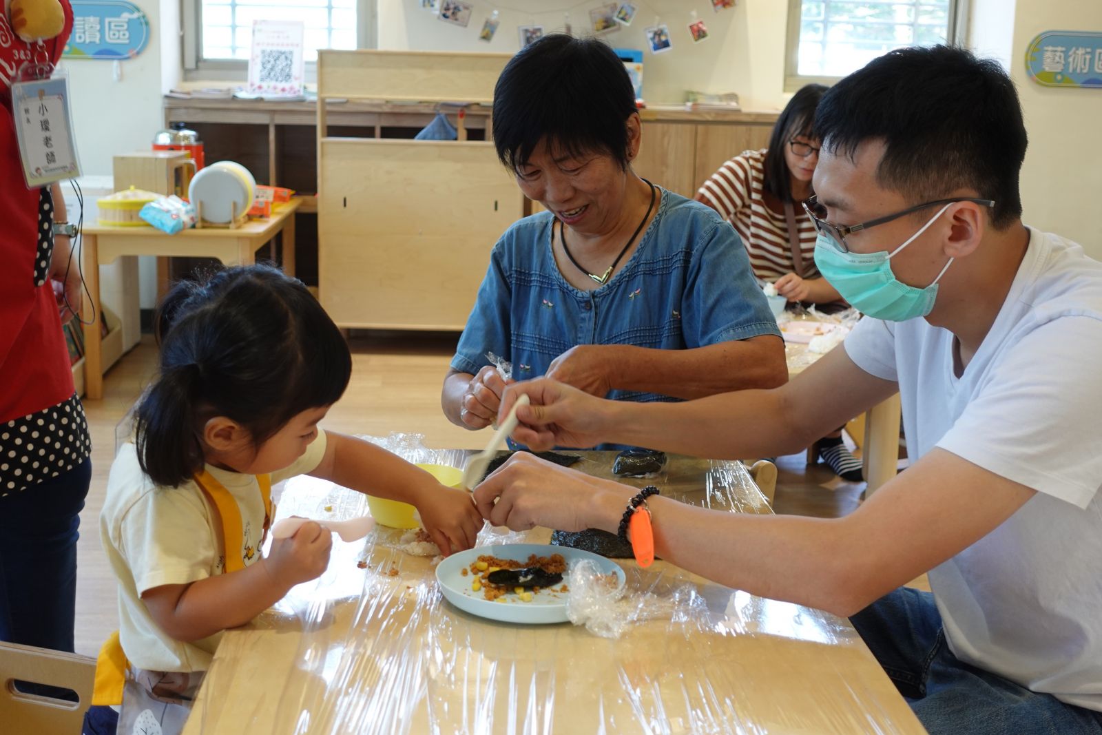 老師透過「我家是動物園」繪本,和親子一起跟著書中角色認識不同的家庭成員,將家人比喻成不同的動物,接著老師請幼兒完成家人稱謂配對卡,最後介紹5月份的端午節是家人們團聚的日子,大小朋友們一起來做端午節的特色粽子,利用海苔將飯和食材包再一起,就完成簡單又有節日氛圍的海苔粽子啦!