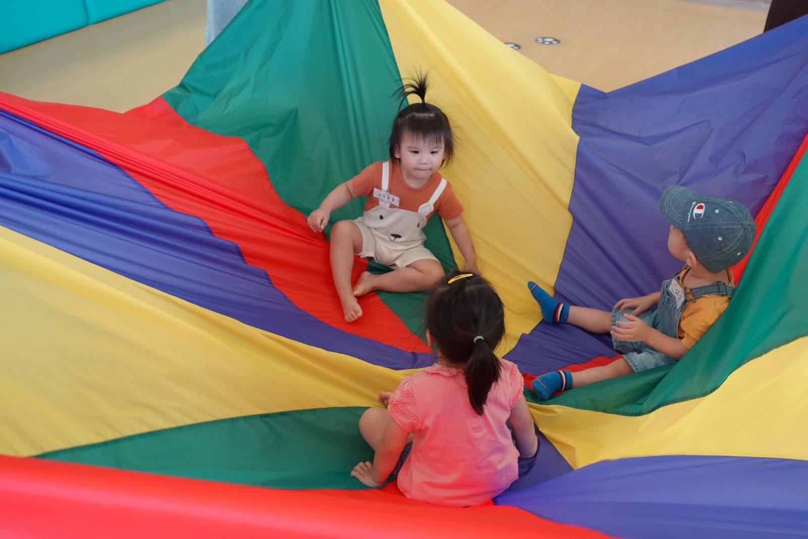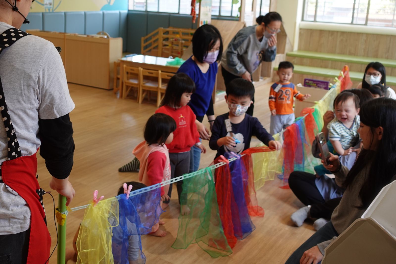 曬衣夾竟然能變出好多好玩的遊戲來~大家一起跟著老師暖暖身後,在館場內蒐集散落的曬衣夾,接著練習使用手的前三指來使用曬衣夾,夾在圈圈上變出一朵太陽花、夾在滑溜布上變成一條長長的鞭炮,最後一起用力的甩一甩,夾子就變成絢爛的煙花,大小朋友們都玩得好開心呀!
