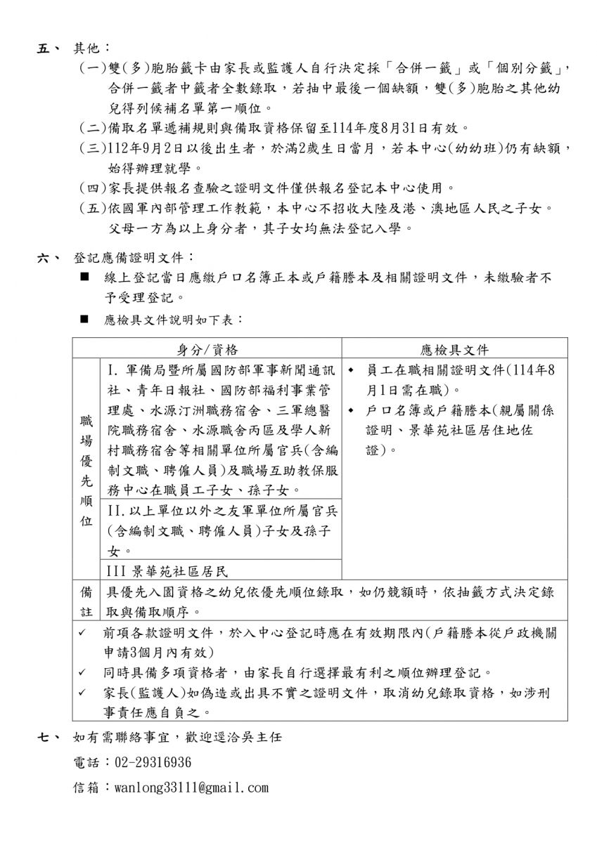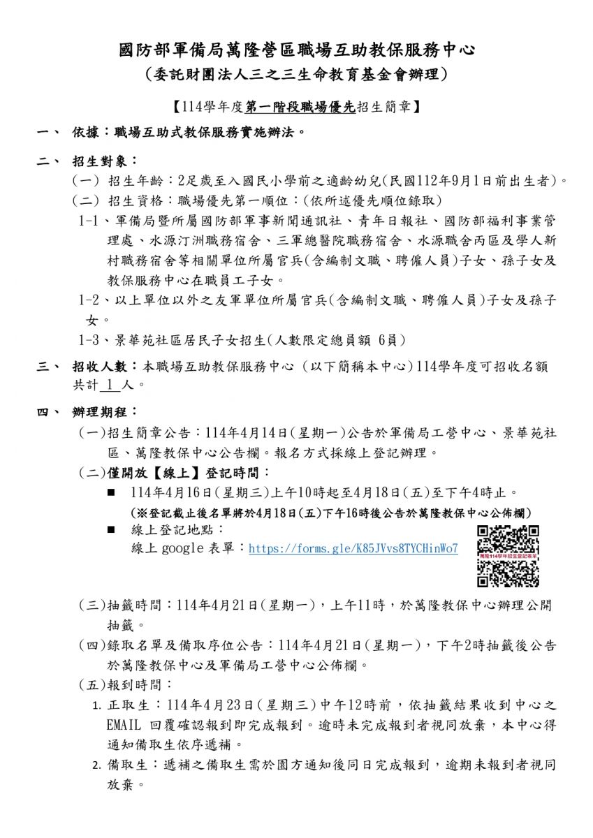 114學年度國防部軍備局萬隆營區職場互助教保服務中心