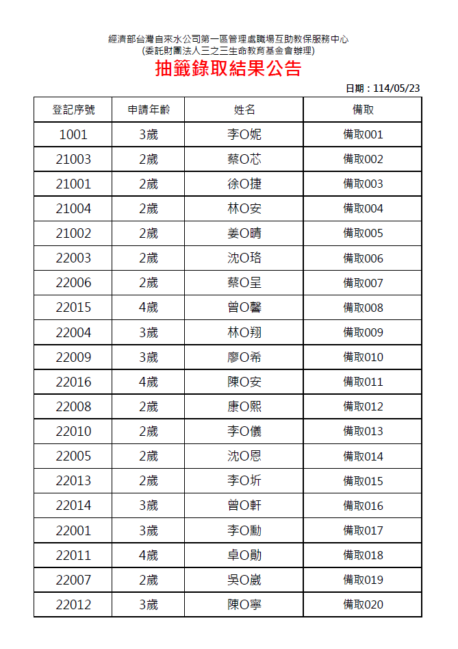114學年度抽籤結果公告