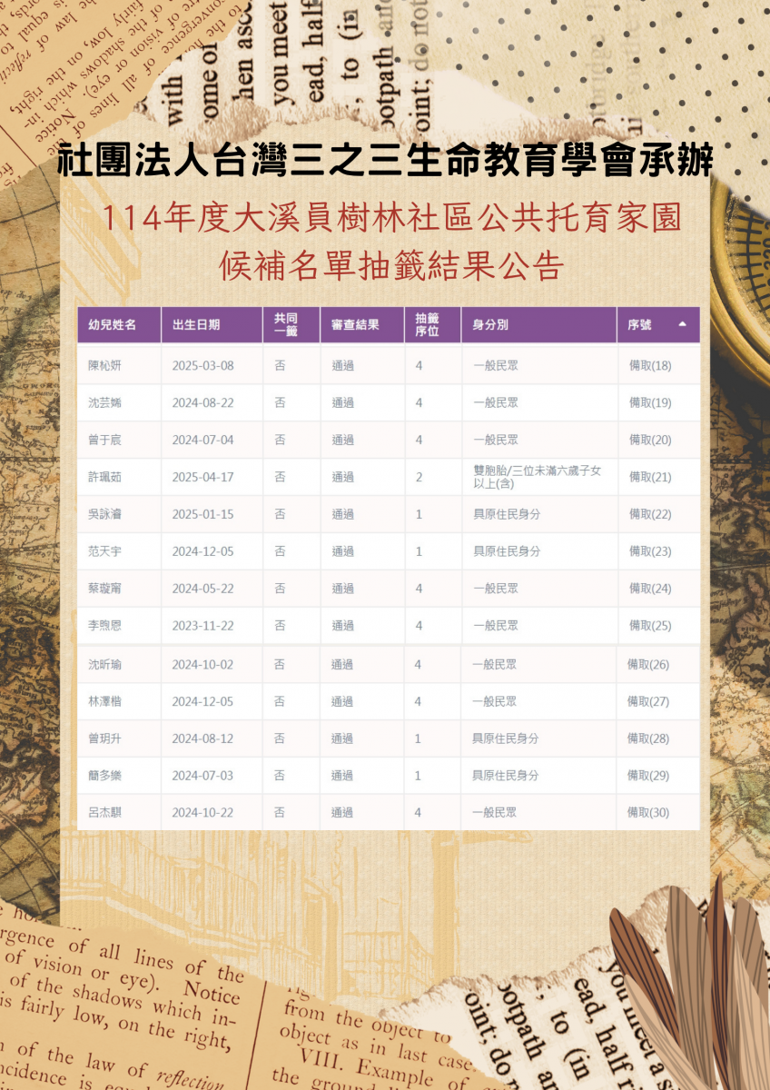 桃園市政府員工子女非營利幼兒園(委託社團法人臺灣三之三生命教育學會辦理)