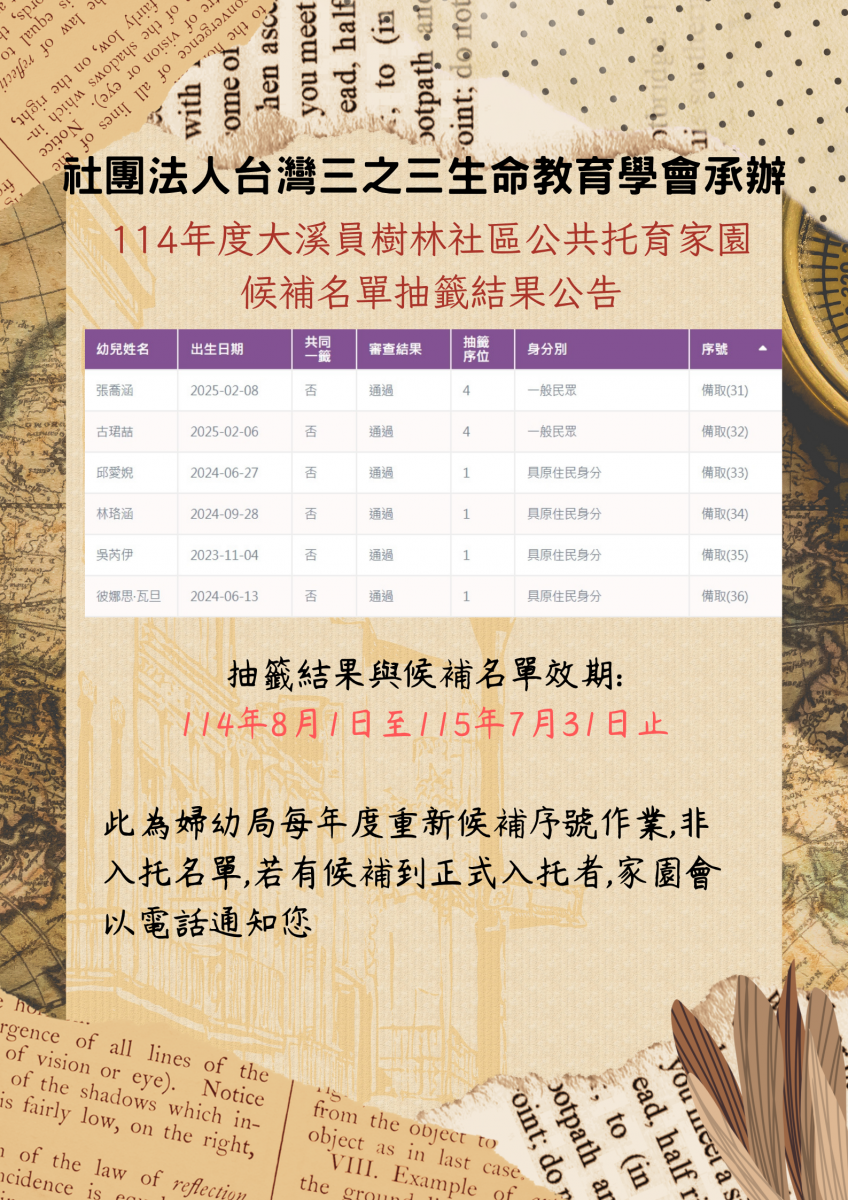 桃園市過嶺非營利幼兒園(委託社團法人臺灣三之三生命教育學會辦理)