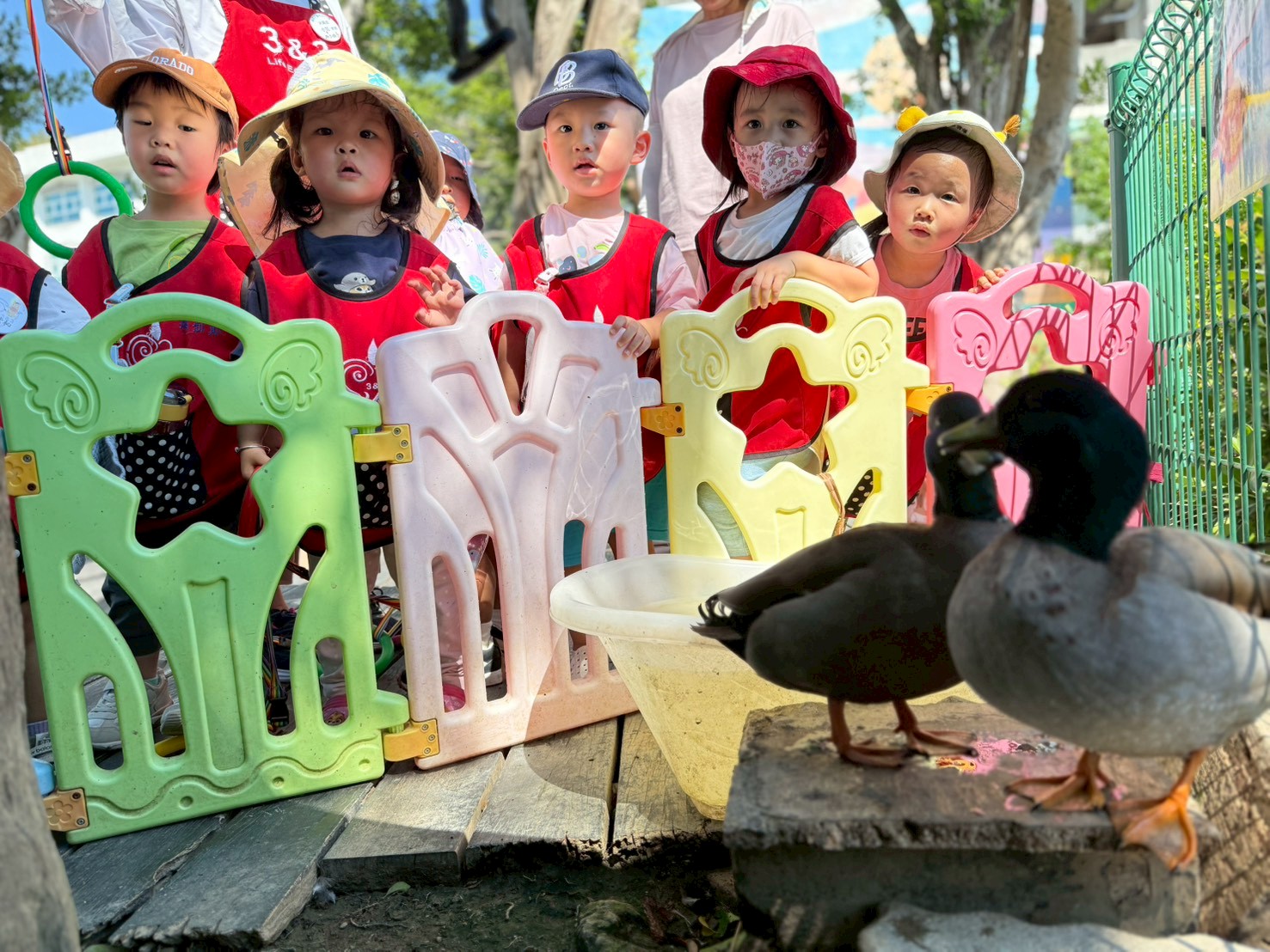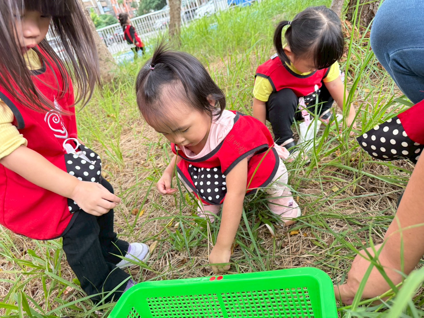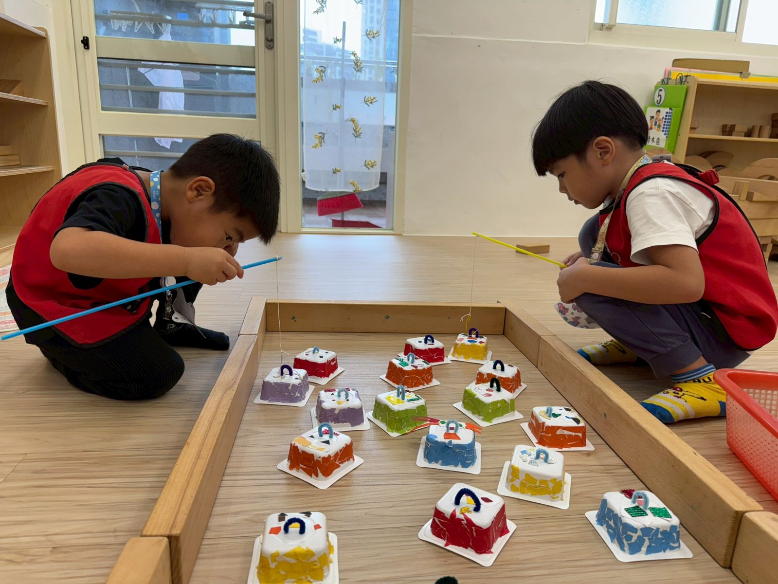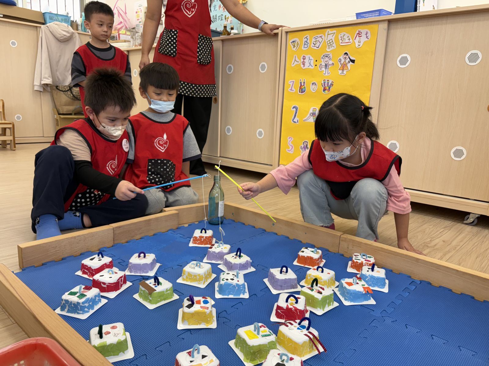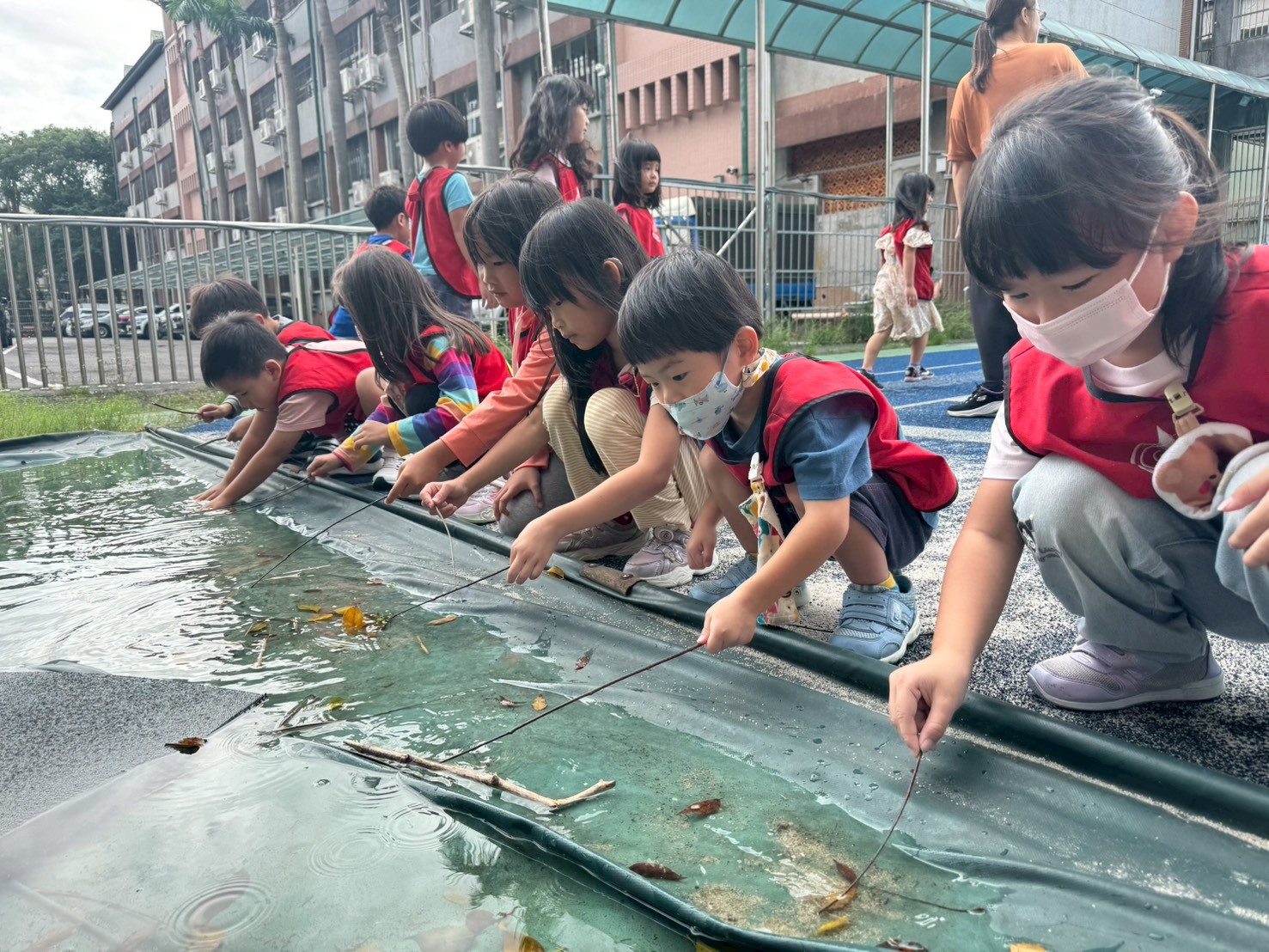 幼兒們在操場沙坑玩釣魚遊戲的美好經驗,大家回想起用樹枝當釣竿、落葉當小魚的快樂時光,提出想自己動手做釣魚玩具的想法。