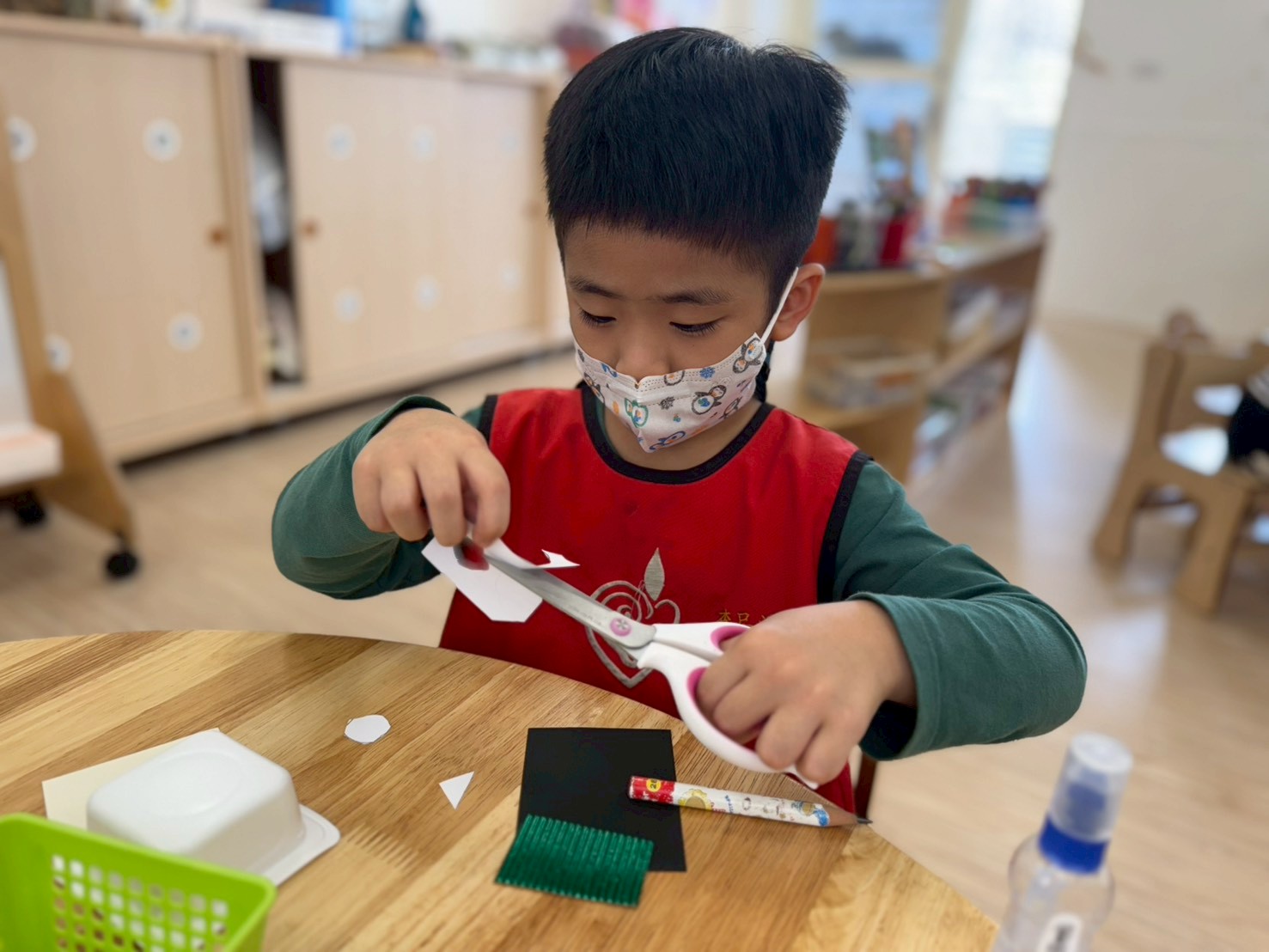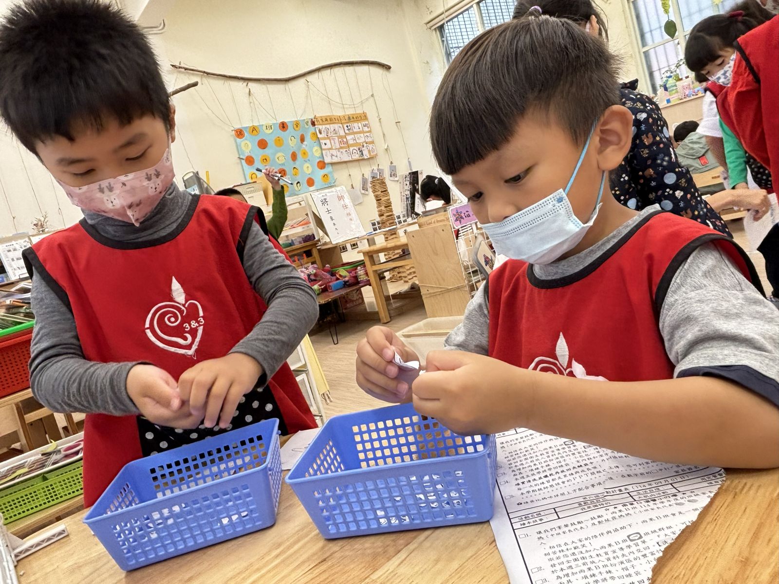 幼兒們化身「造紙職人」,體驗造紙的步驟:先從碎紙收集盒中取出廢紙,撕成小片後泡在水裡,用手揉捏出「紙漿」,再用抄網撈起並晾乾。
