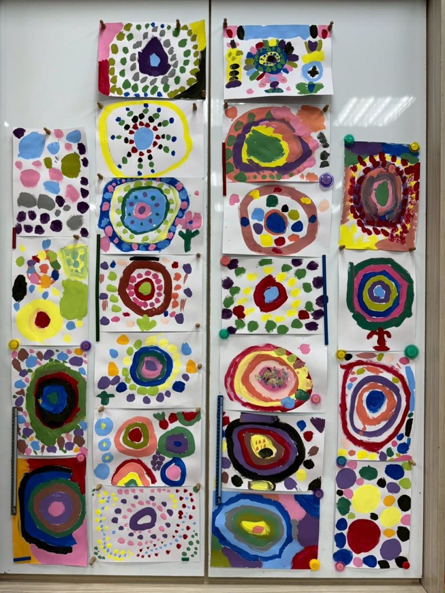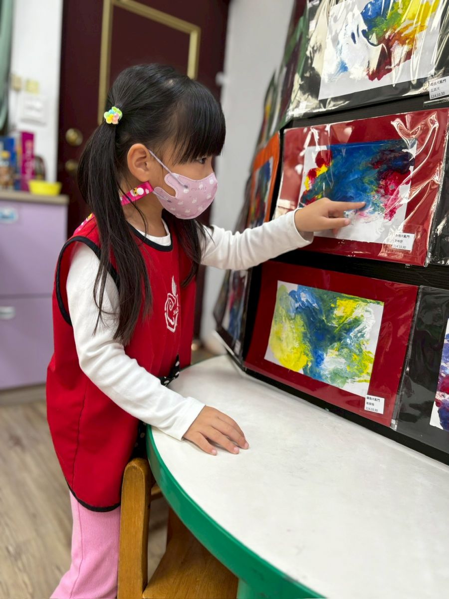 我們一起欣賞形狀藝術家們的作品,有蒙德里安的格子畫、還有康丁斯基的同心圓。寶貝們除了實際動手進行格子畫及同心圓的創作,也嘗試著將不同的顏色進行混合,並完成一幅幅各具特色的圓點創意畫。完成作品後,寶貝們會互相分享對彼此作品的感受與想法,從中培養美的視野。