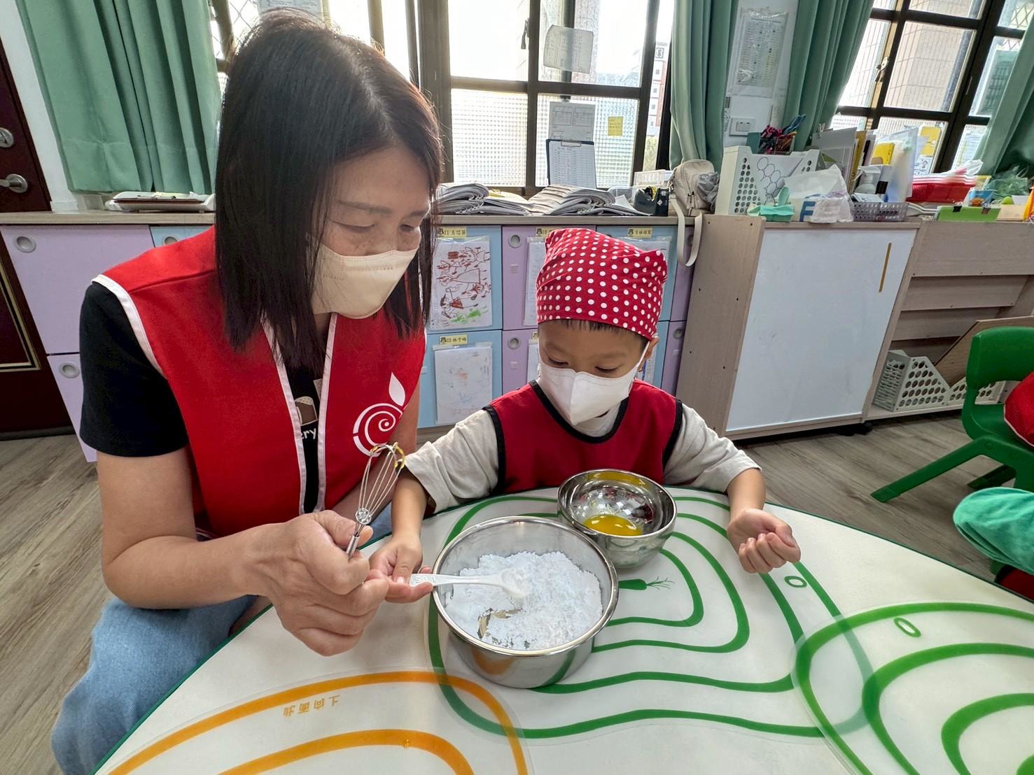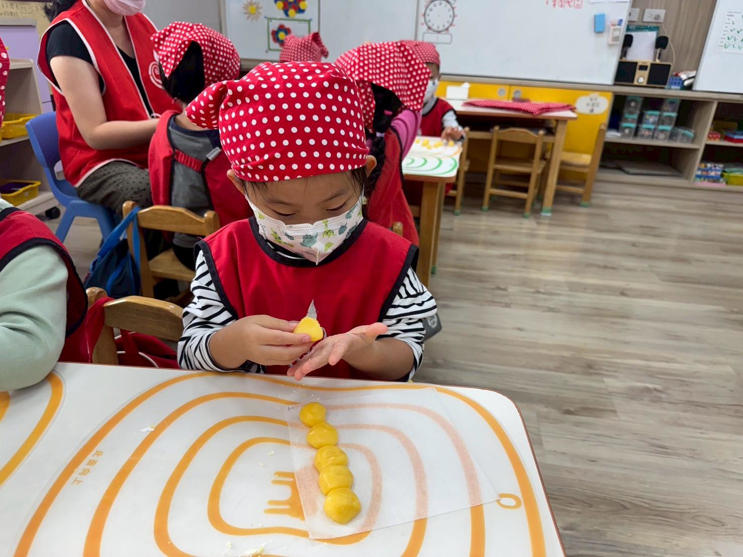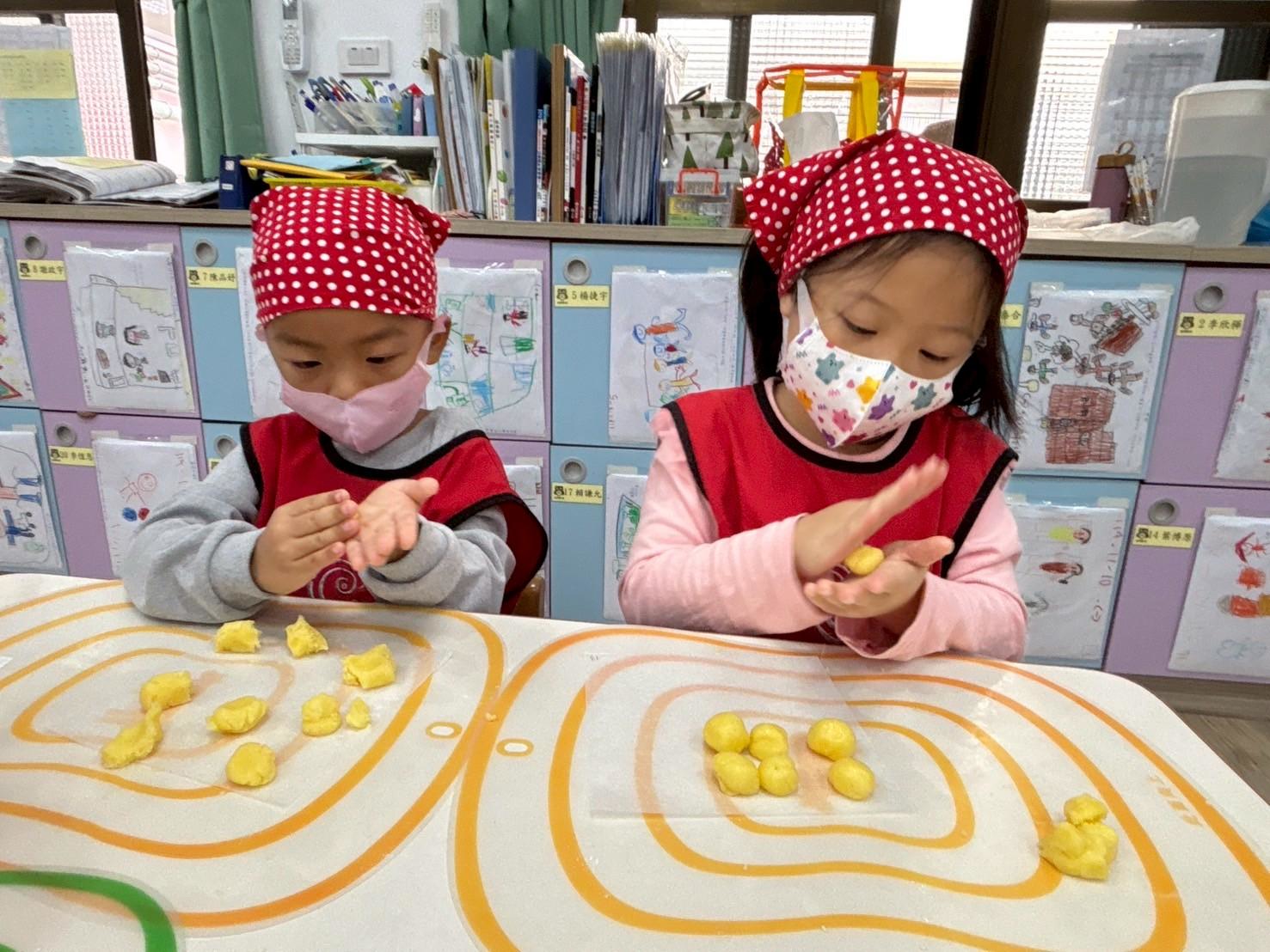 簡單的小點心藏著各種手眼協調動作的練習,像是攪拌、平分、搓圓......等技巧,完成的小饅頭餅乾更是藏著孩子們的用心與分享的心意。