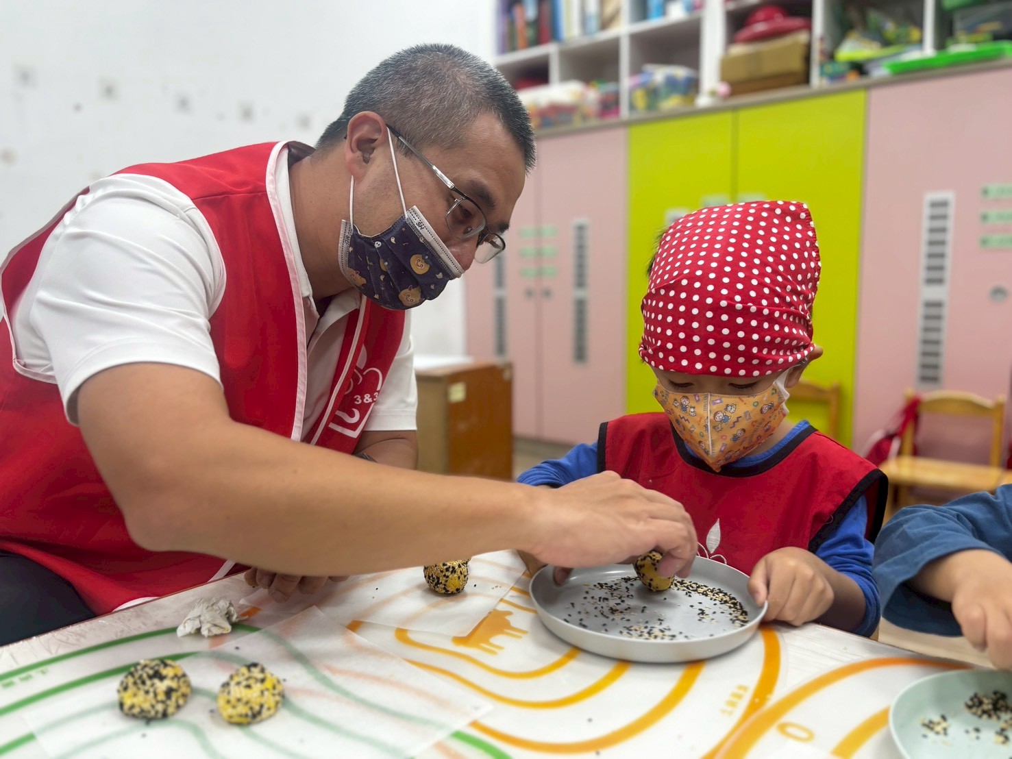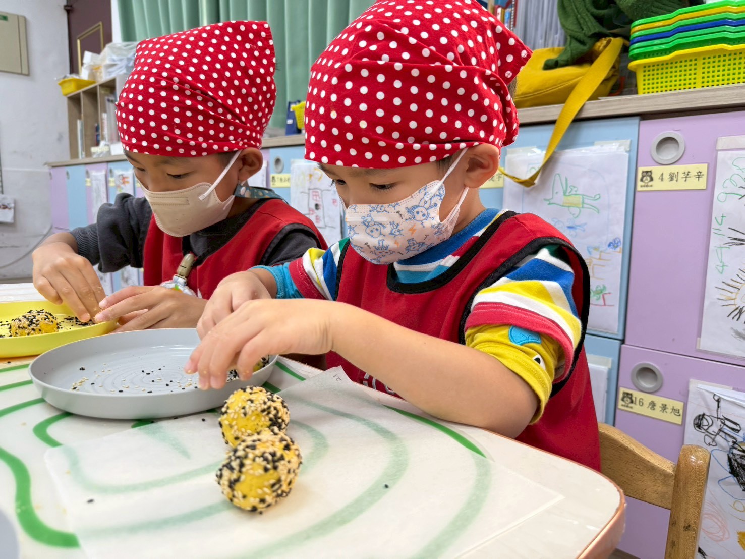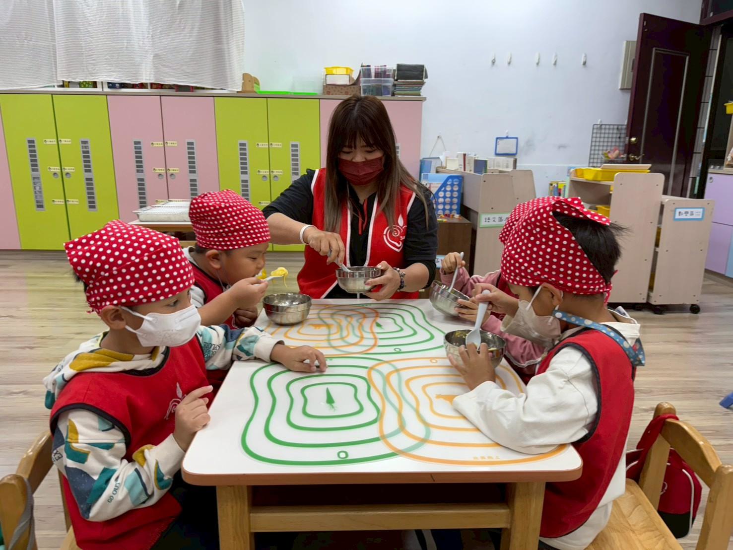 簡單的小點心藏著各種手眼協調動作的練習,像是攪拌、平分、搓圓......等技巧,完成的小饅頭餅乾更是藏著孩子們的用心與分享的心意。