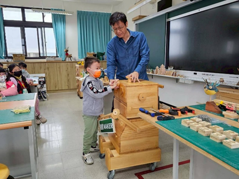 跟樹德國小的木工楊老師請教,楊老師介紹基本的工具:鋸子、磨砂紙、手鑽機器、A夾、F夾,甚至介紹哥哥姊姊的木工作品,還有楊老師設計的樹德機器人,專門輸送平板給哥哥姊姊用,希望每個人都能打開智慧的腦,好好的收納與小心的使用,學習愛護公用物品,楊老師像在講故事一樣,帶我們認識木工的作品每個都有故事,讓我們也想動手做一個有故事的作品。