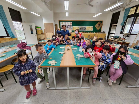 志工家長忞臻、鈞翔阿嬤教幼兒如何包粽子,以及敦親睦鄰分享給樹德國小校長及幼兒園全園幼兒,