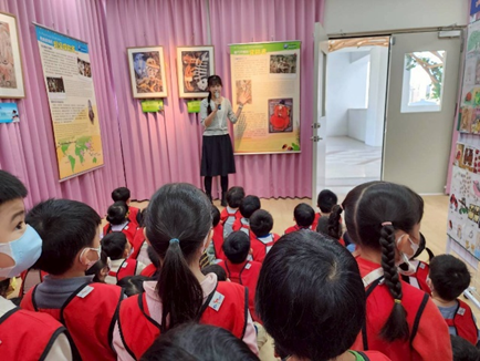 爺爺從獵人轉變成保育人士,他畫了許多的動物畫,在參觀的時候,看到爺爺的創作很豐富,聽著老師說的故事,畫作更有獨特的風格,看到哥哥和姐姐運用多元的素材進行創作,融合著爺爺的一些畫法、或者畫面中出現動物、也有婆憂鳥在畫面中,非常有創意。