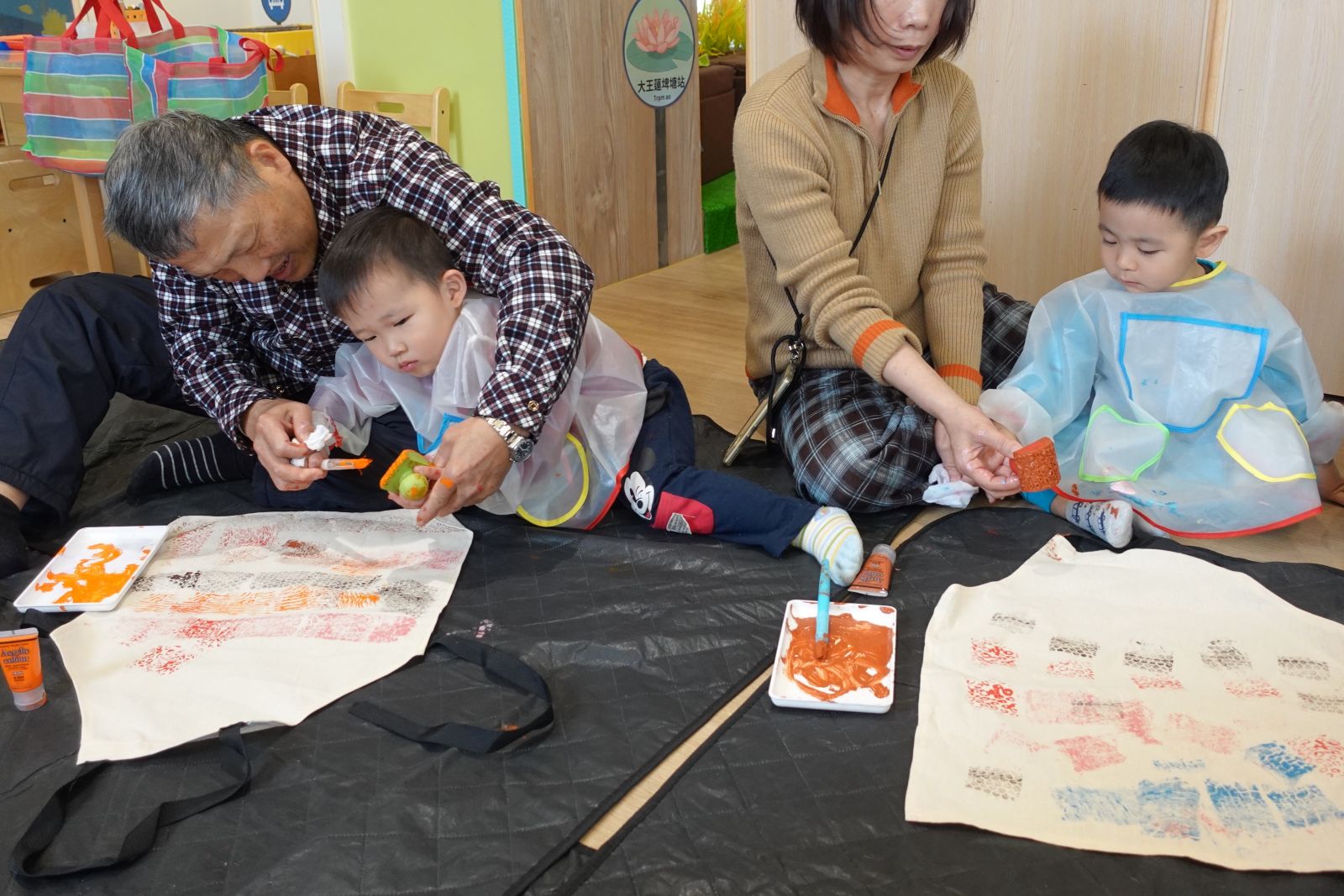 老師帶著親子一起閱讀繪本《小雞逛超市》,跟著故事情節一起找找藏在超市裡的小雞和小豬,大小朋友都很認真在尋找呢,同時也學習到原來逛超市前可以先列清單,分辨「想要」和「需要」,做個聰明消費者。接著親子們動手製作專屬的「帆布袋印畫」,用吹氣鼓起的塑膠袋沾上顏料,輕輕蓋印出繽紛的圖案。一個個創意滿滿、色彩繽紛的袋子就完成啦,親子可以帶著袋子去超市買東西,環保愛地球!