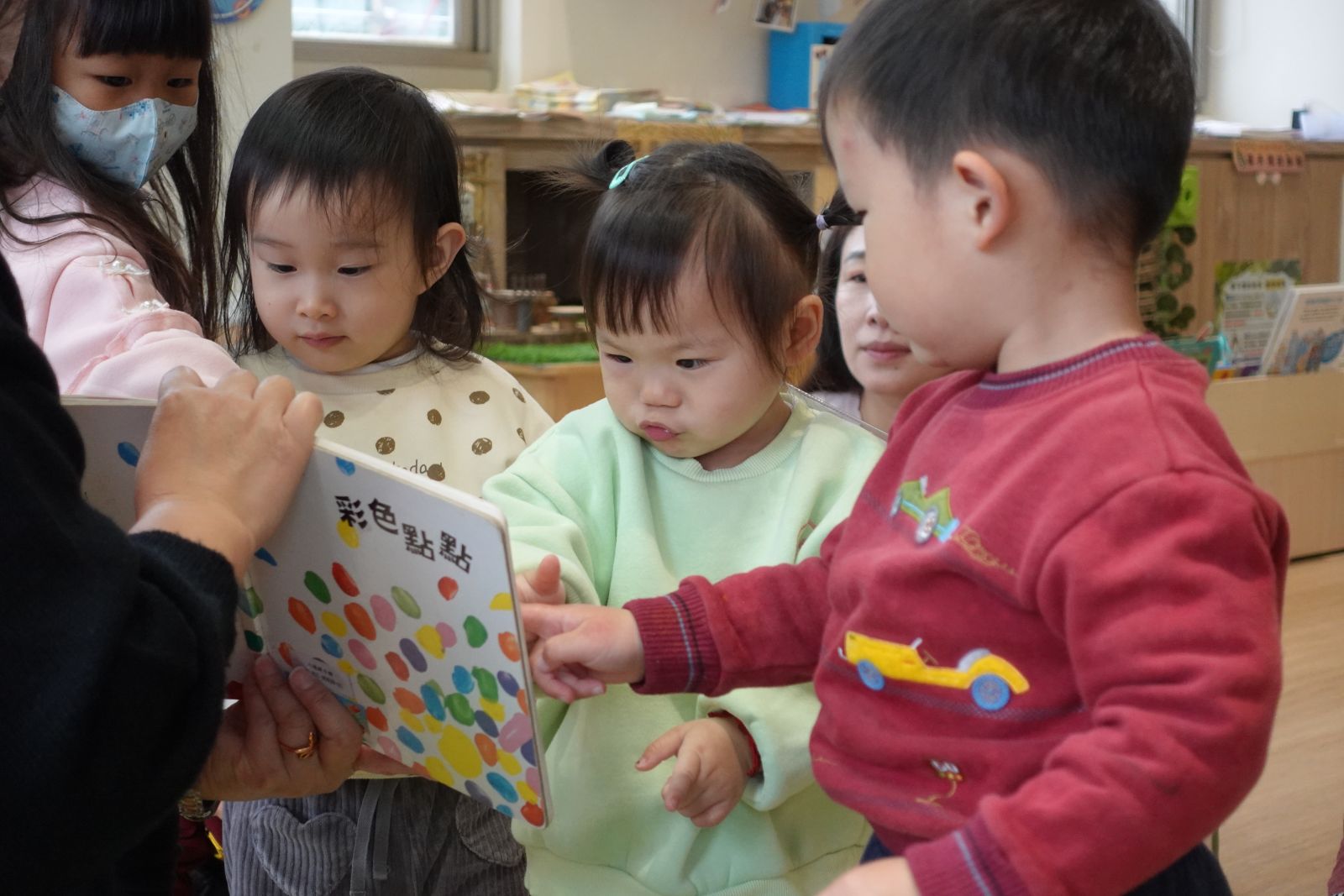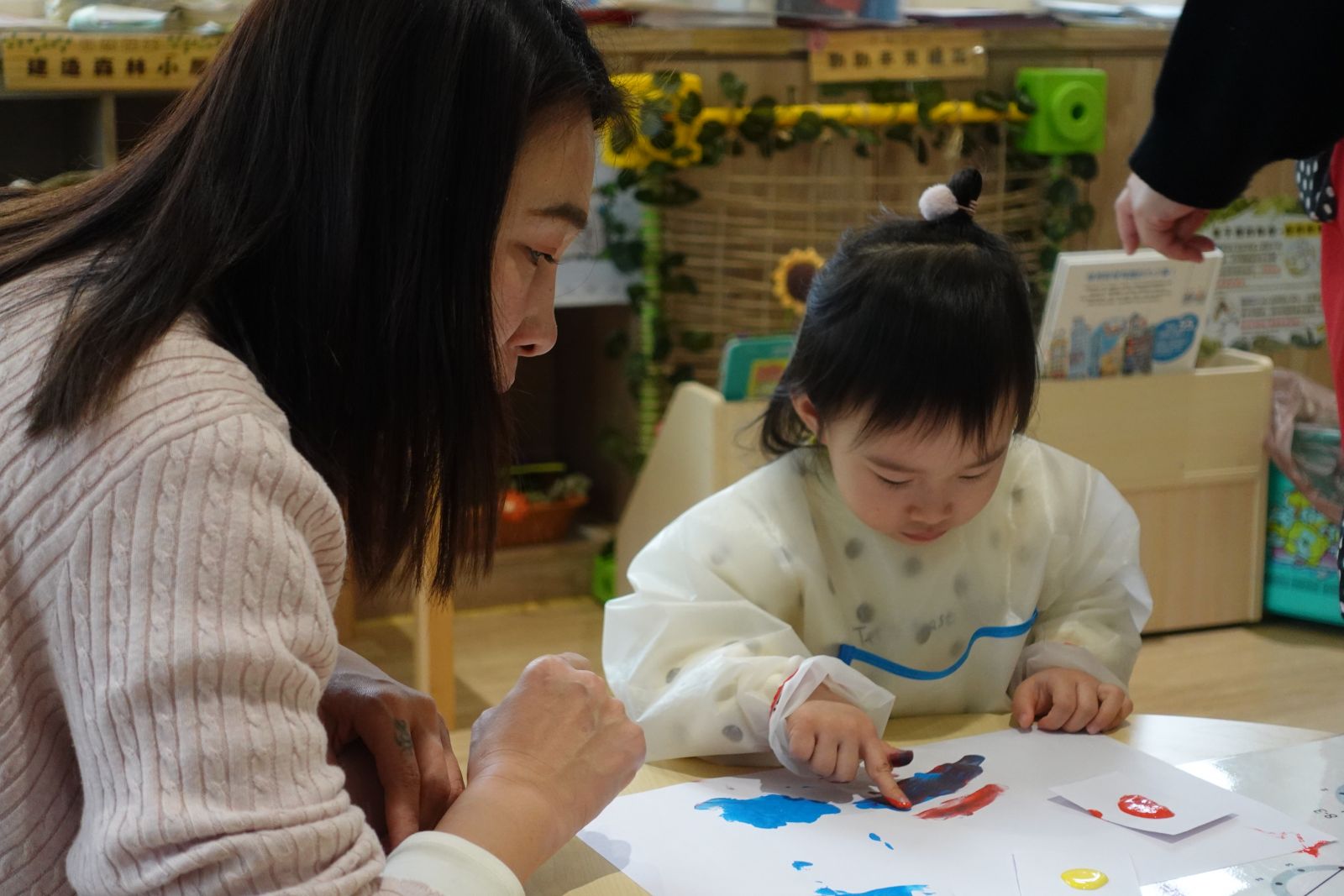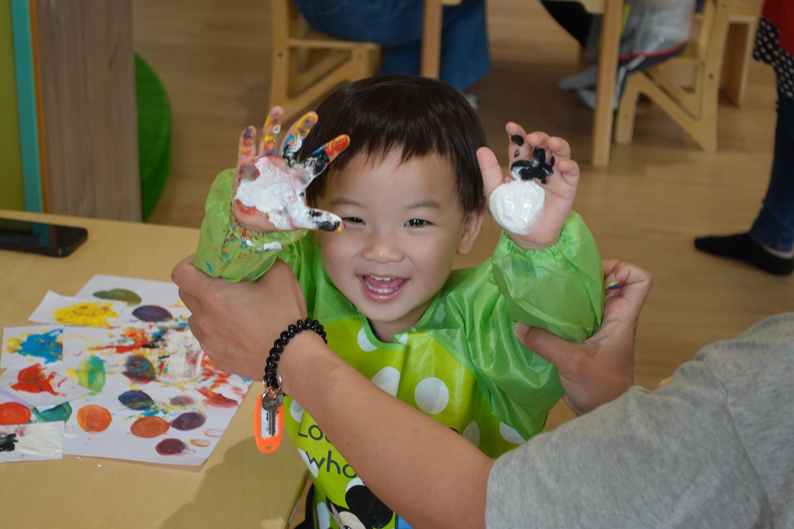 老師透過彩虹帶領親子認識七種顏色,並共讀《彩色點點》,引導幼兒用小手體驗顏色混合的神奇變化。接著一起用顏料沾手創作,點出不同顏色,親子在遊戲中感受色彩變化的樂趣。