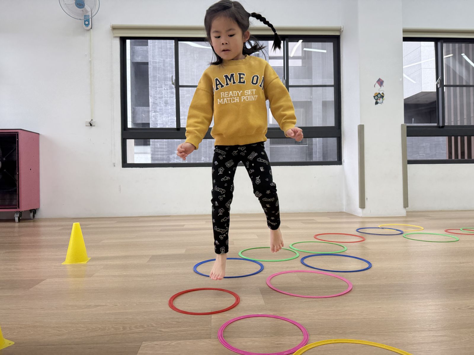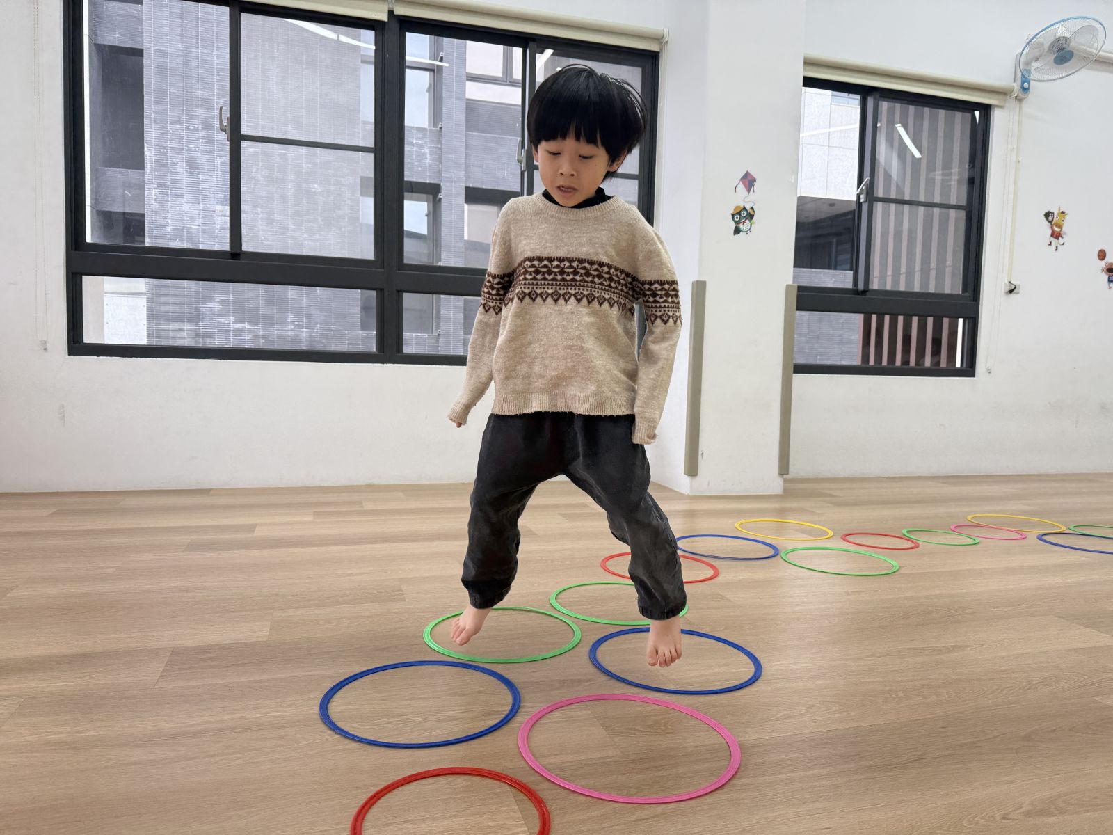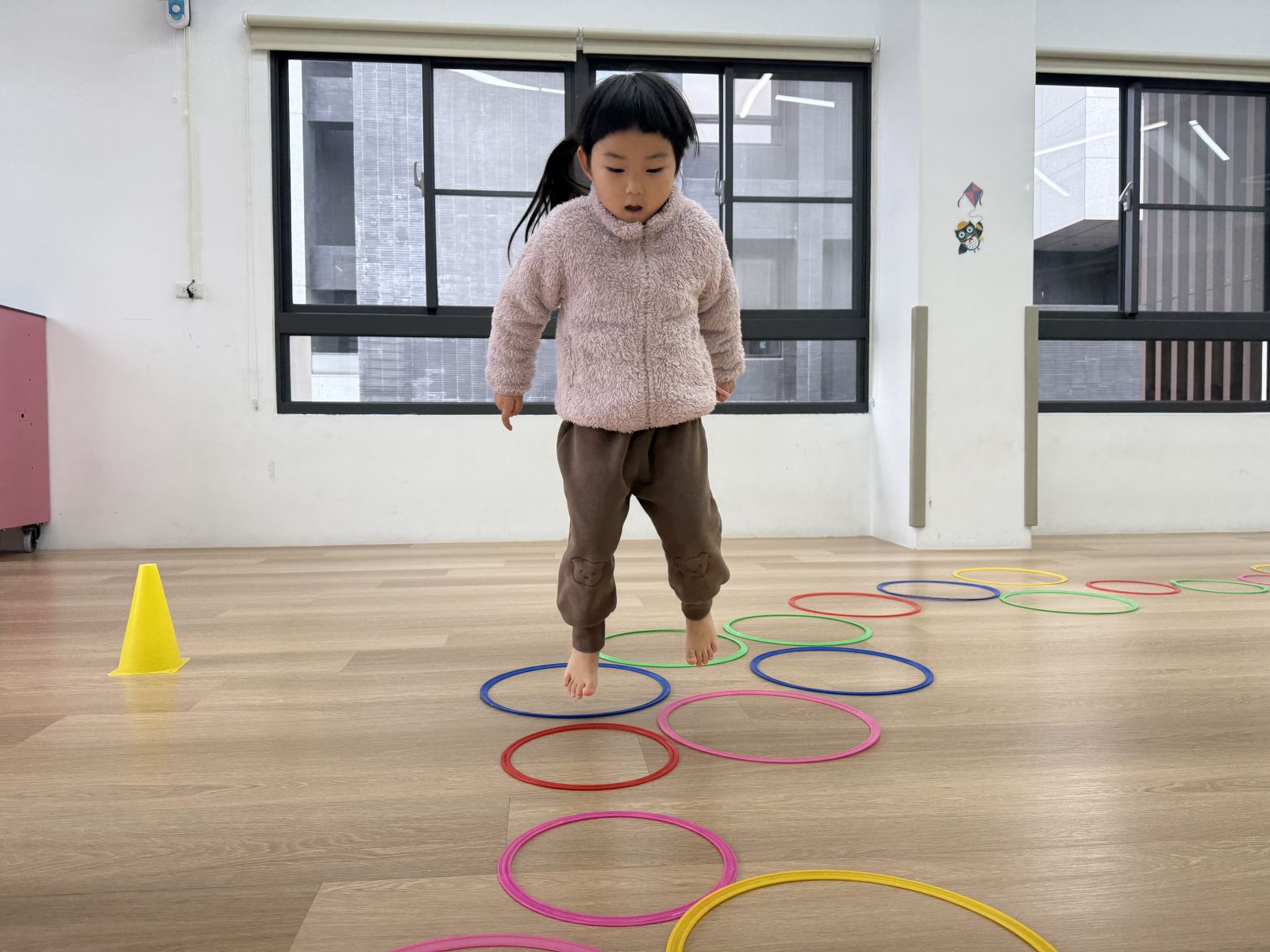 藉由不同大小的呼拉圈,透過不同的跳躍方式,從雙腳跳、開合跳到單腳跳,每一次的轉換不只考驗孩子的協調性,也提升孩子的觀察力與專注力,單腳跳增加孩子的肢體協調性與穩定性。