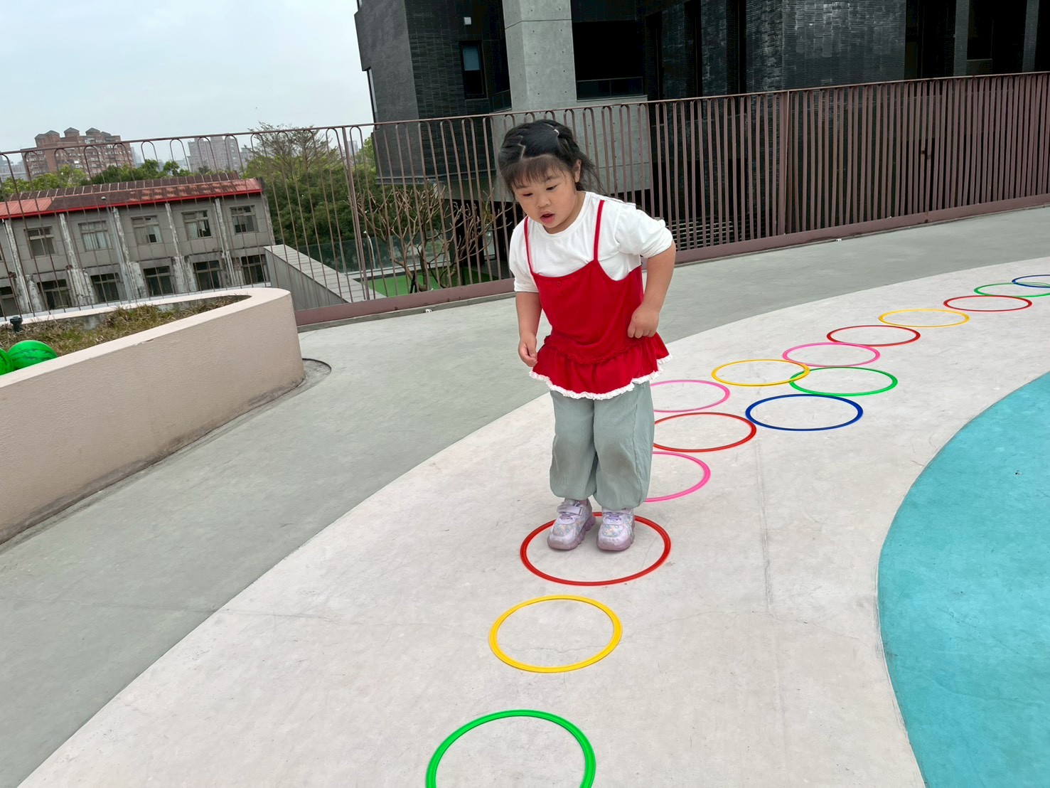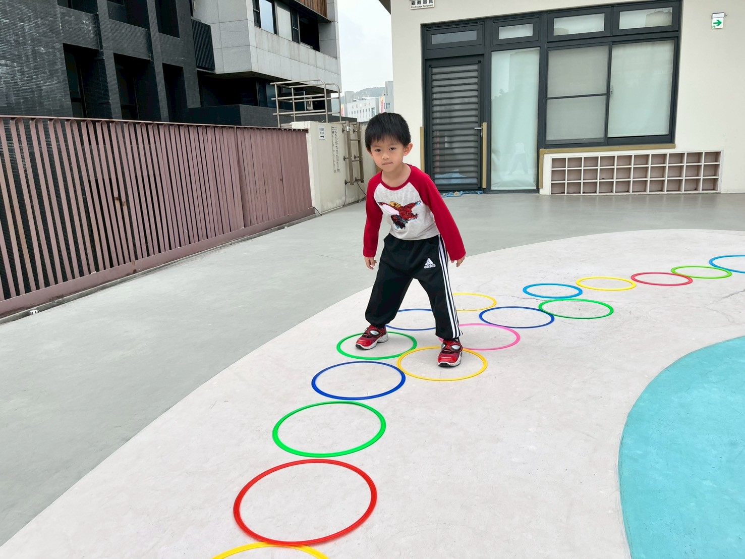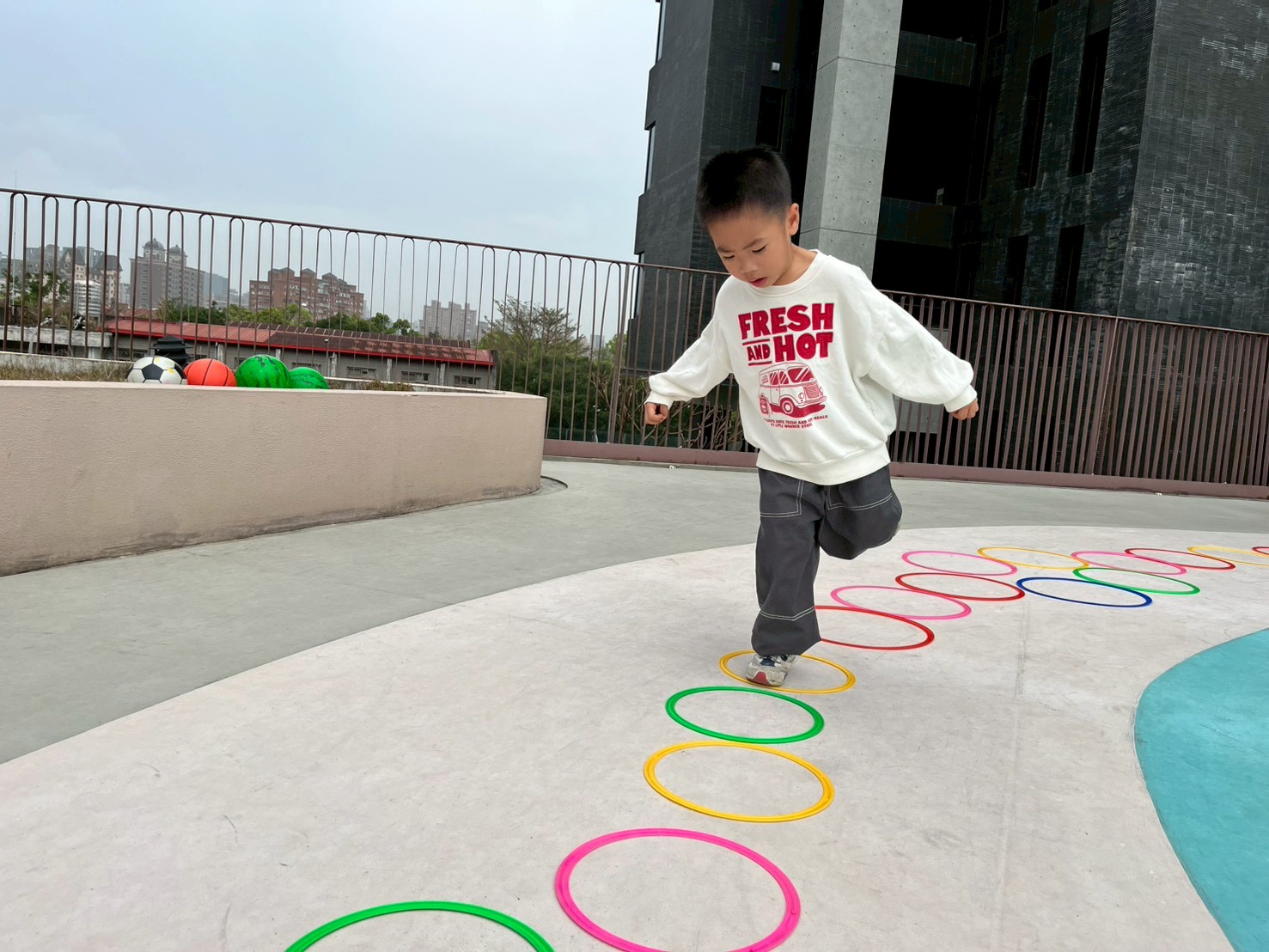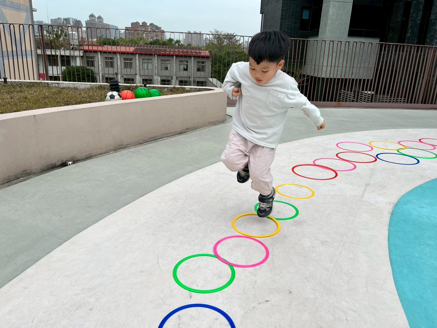藉由不同大小的呼拉圈,透過不同的跳躍方式,從雙腳跳、開合跳到單腳跳,每一次的轉換不只考驗孩子的協調性,也提升孩子的觀察力與專注力,單腳跳增加孩子的肢體協調性與穩定性。