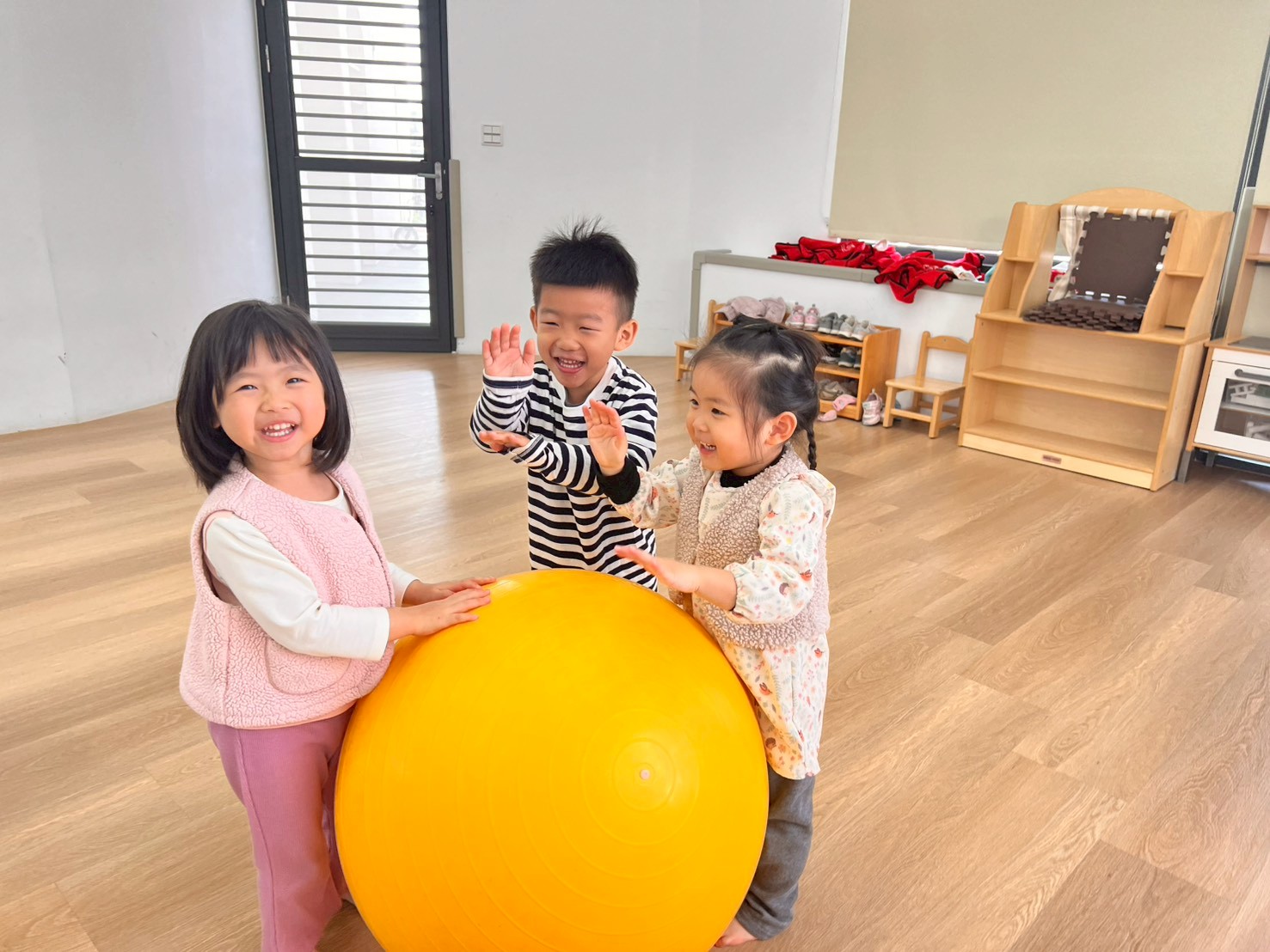請孩子們想像大龍球是炸彈,體驗閃躲大龍球的過程,孩子們會牽手一起逃走,有的孩子看到球準備過來就會往後跑走,從中增強反應力與專注能力。