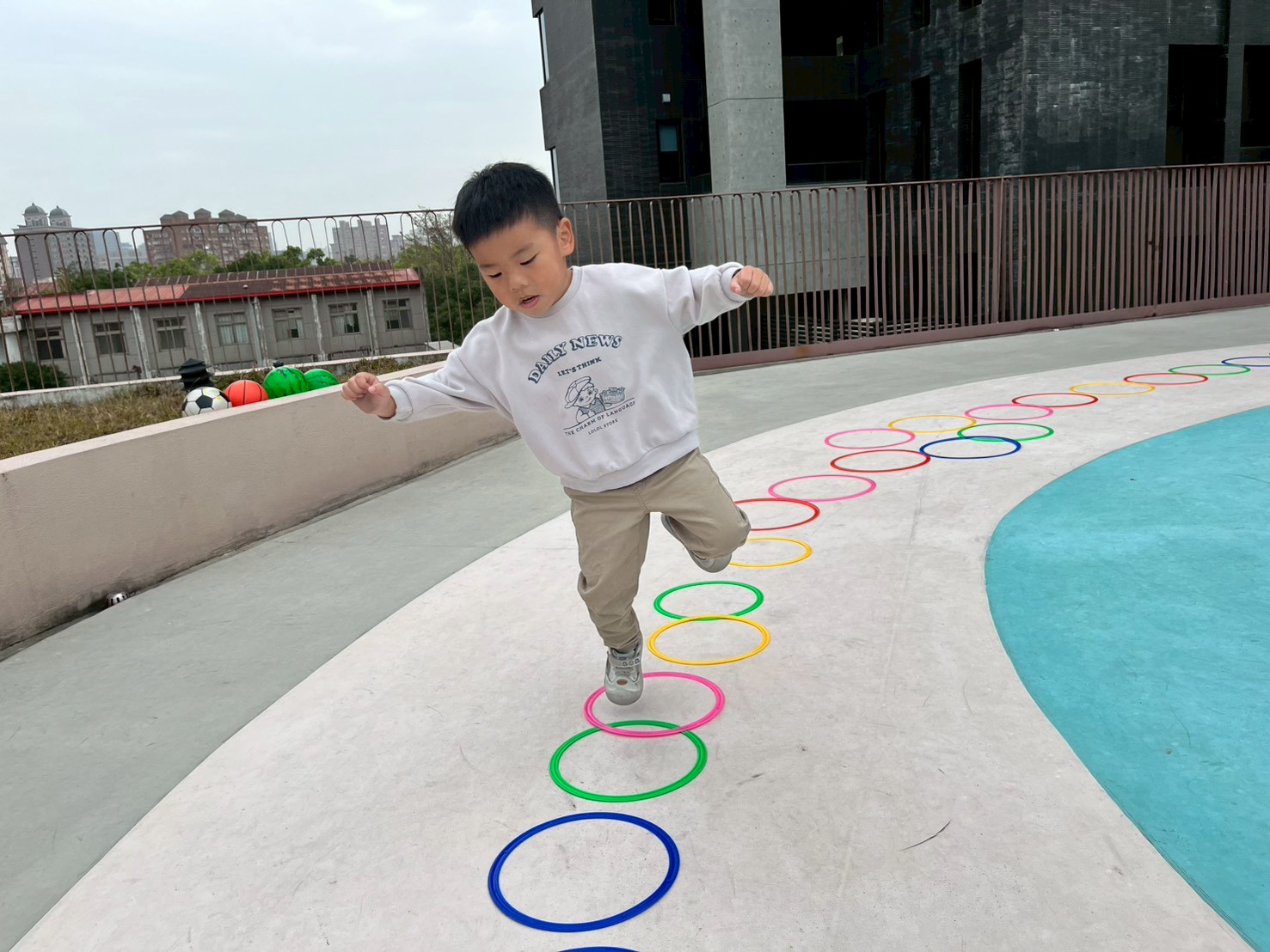 孩子透過跳躍、平衡和跨越彩色石頭,鍛煉身體協調性與平衡感,增強運動能力。