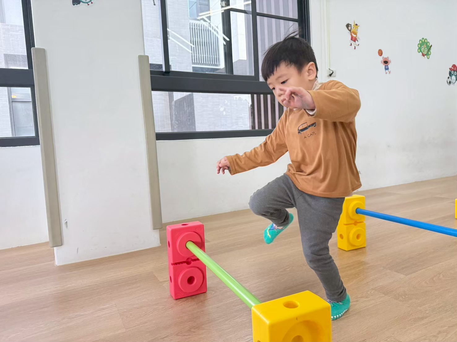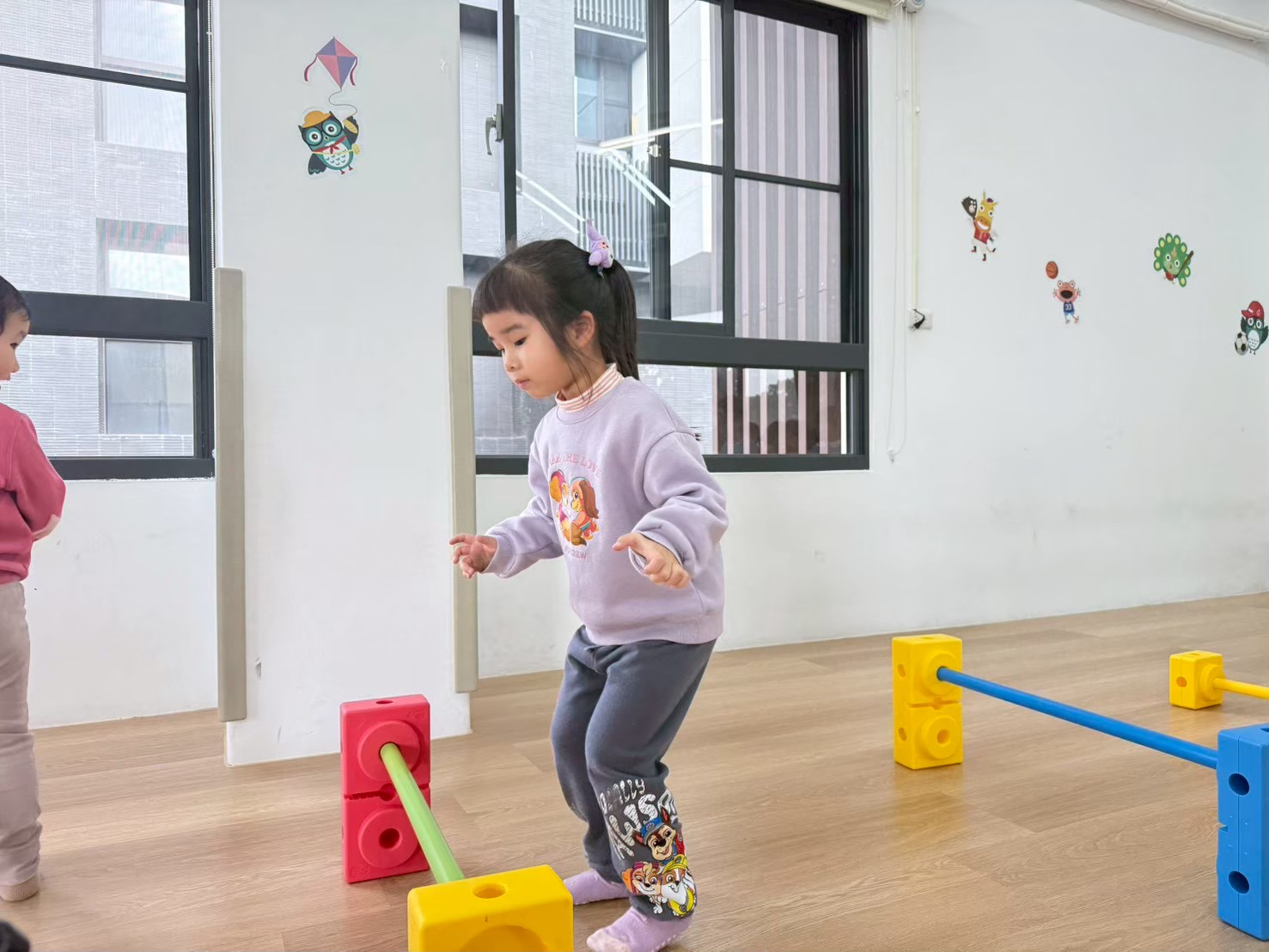 孩子透過雙腿夾泡棉棒的活動,孩子練習在行走中維持平衡與協調,提升下肢力量與身體控制,也從遊戲中建立專注與挑戰自我的信心。